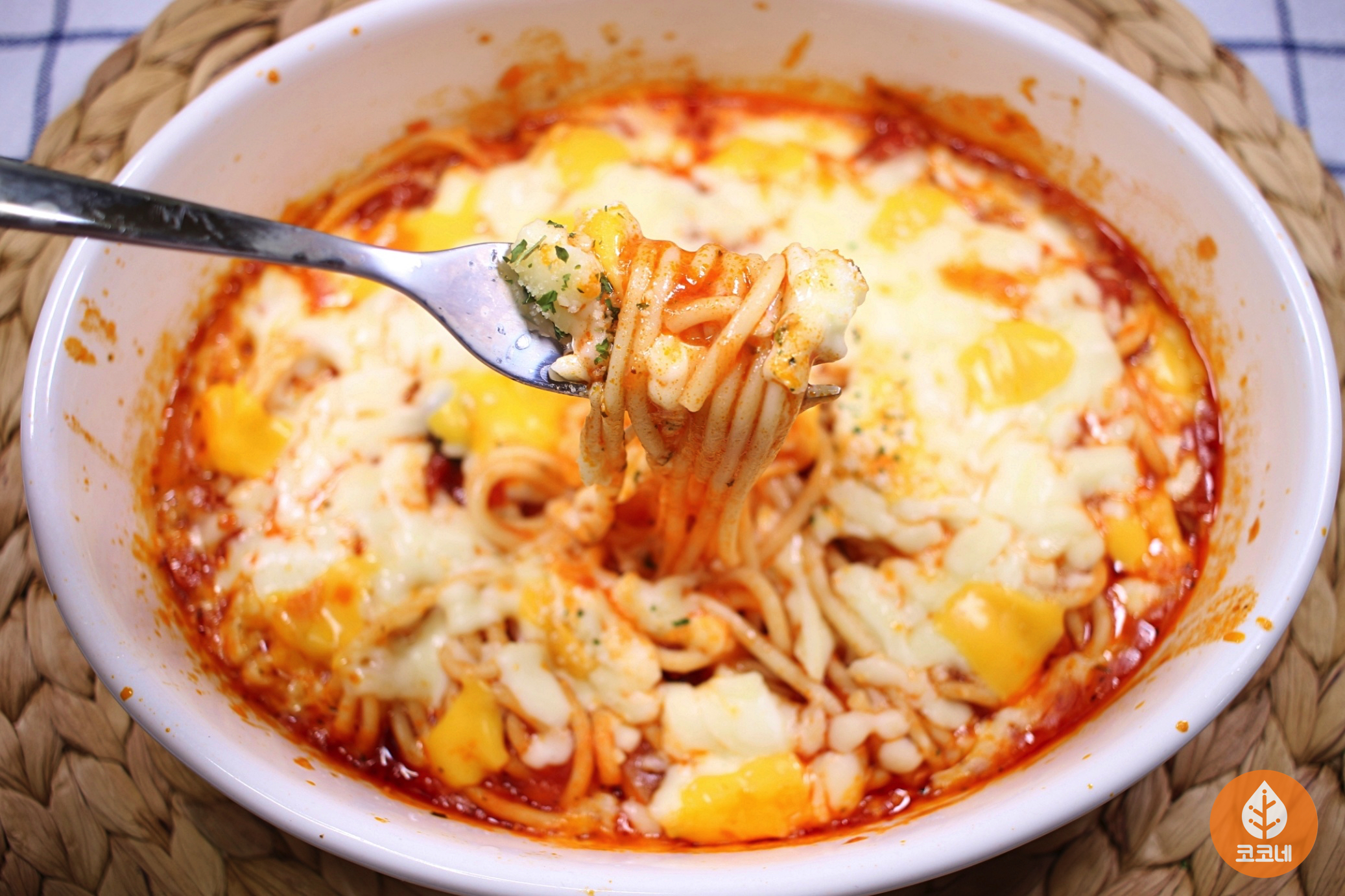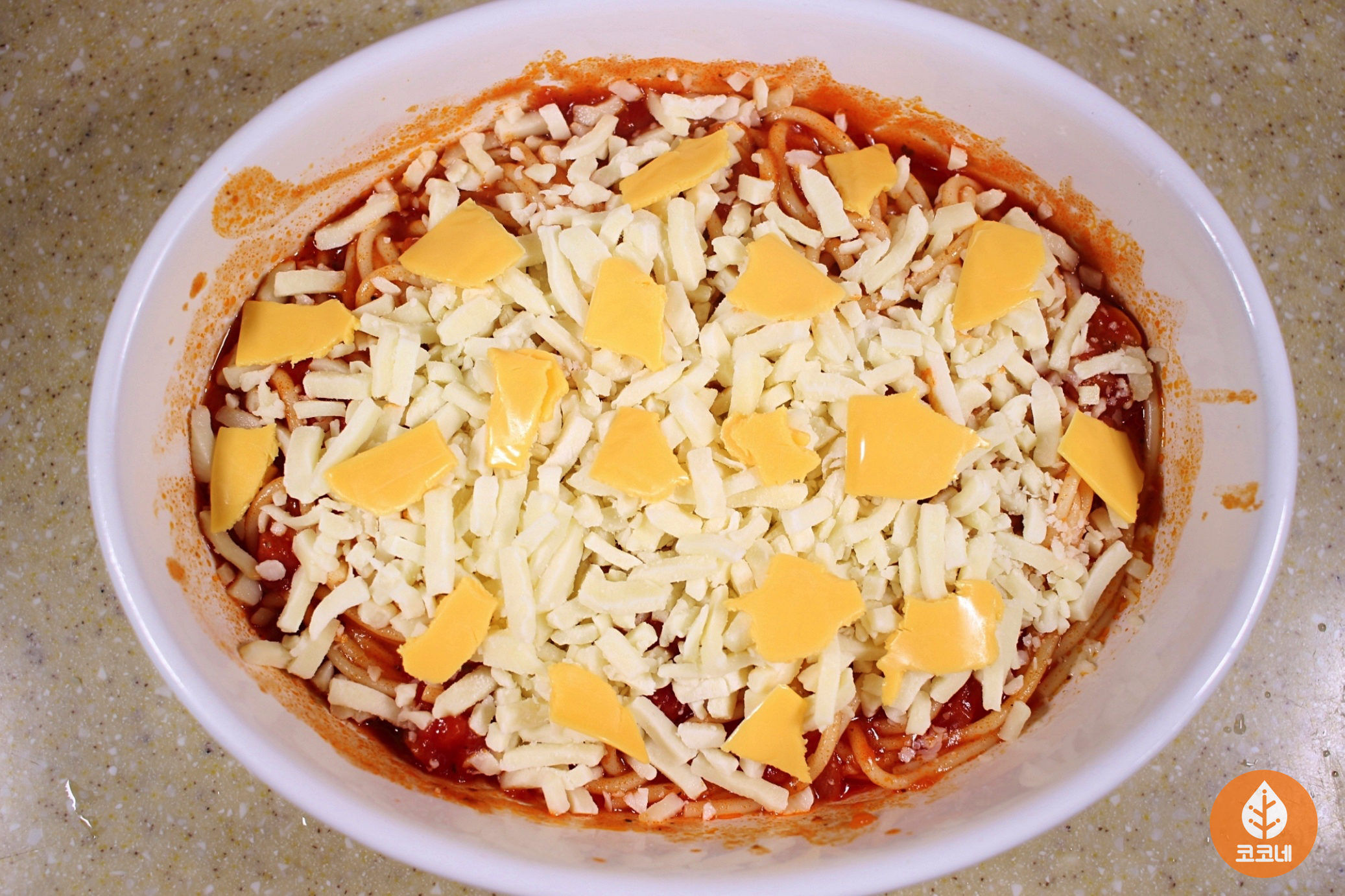 스파게티면, 토마토소스, 슬라이스치즈, 모짜렐라치즈,