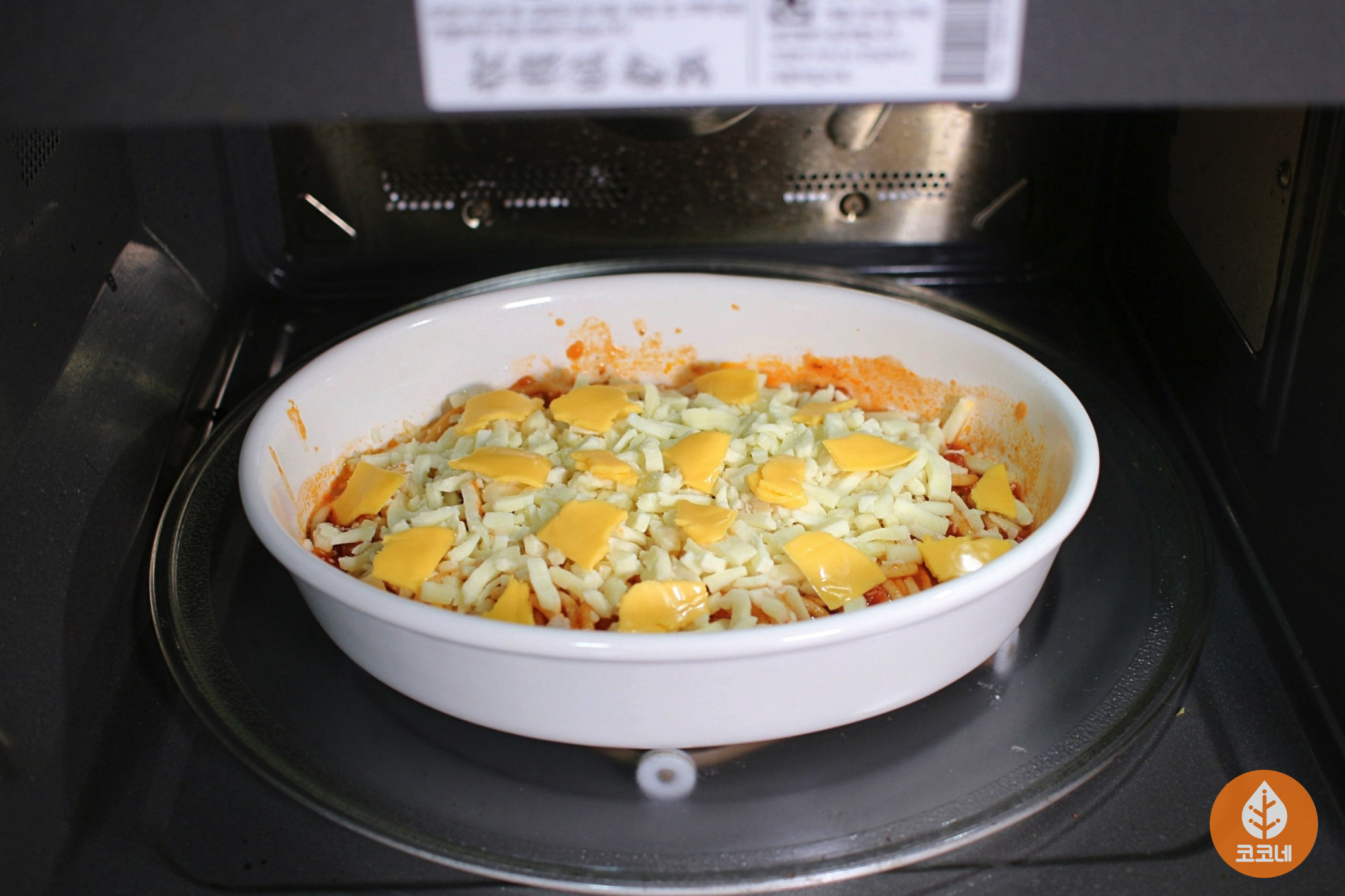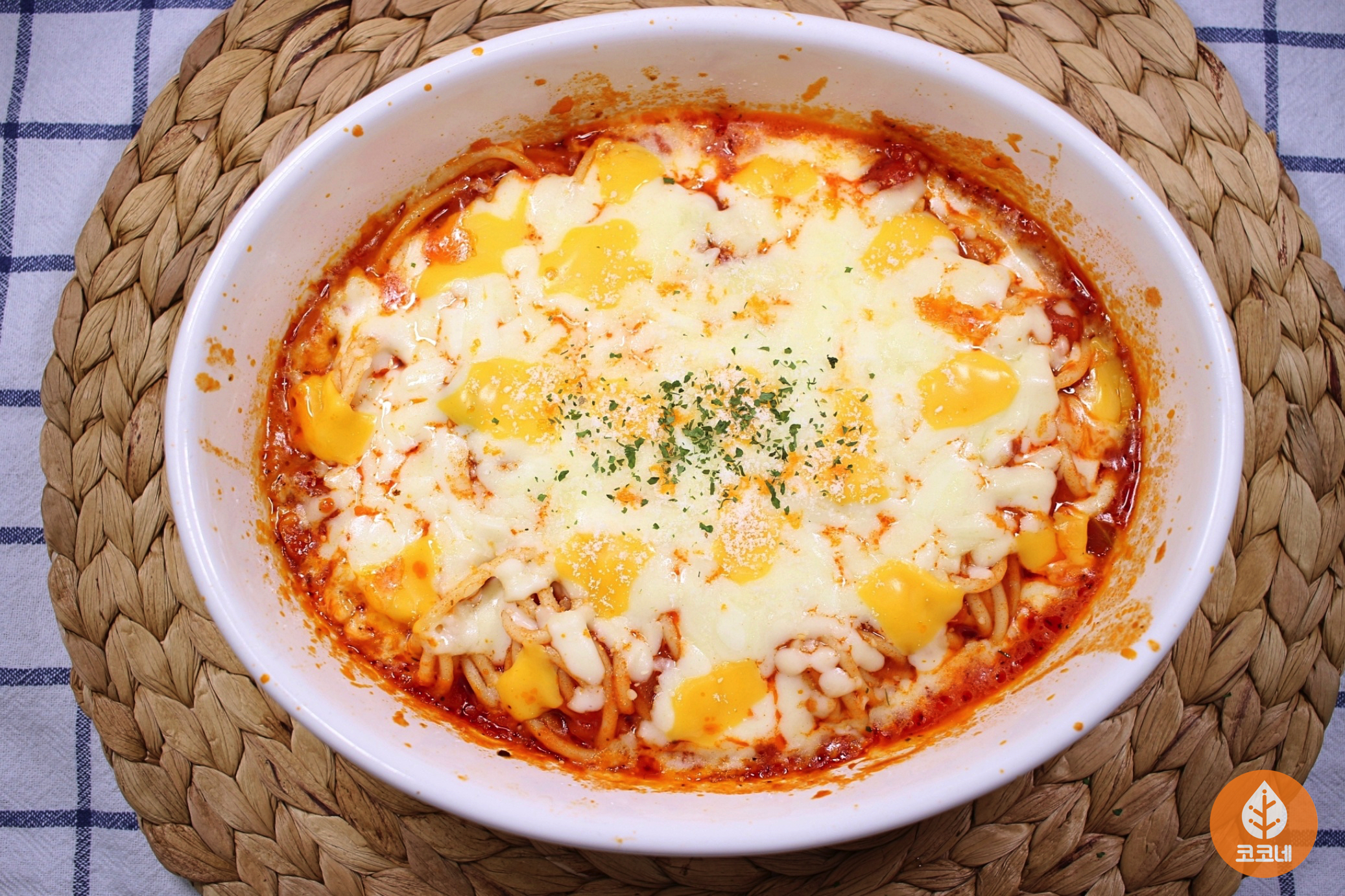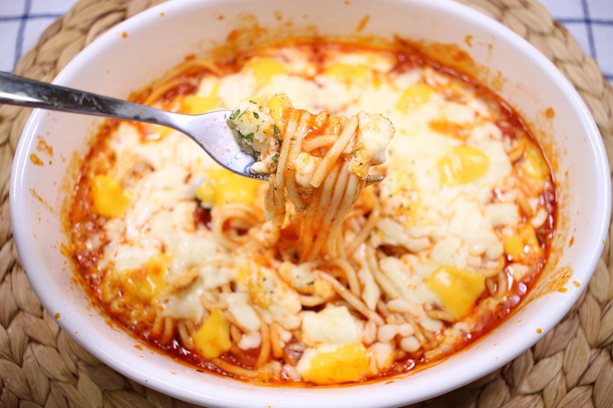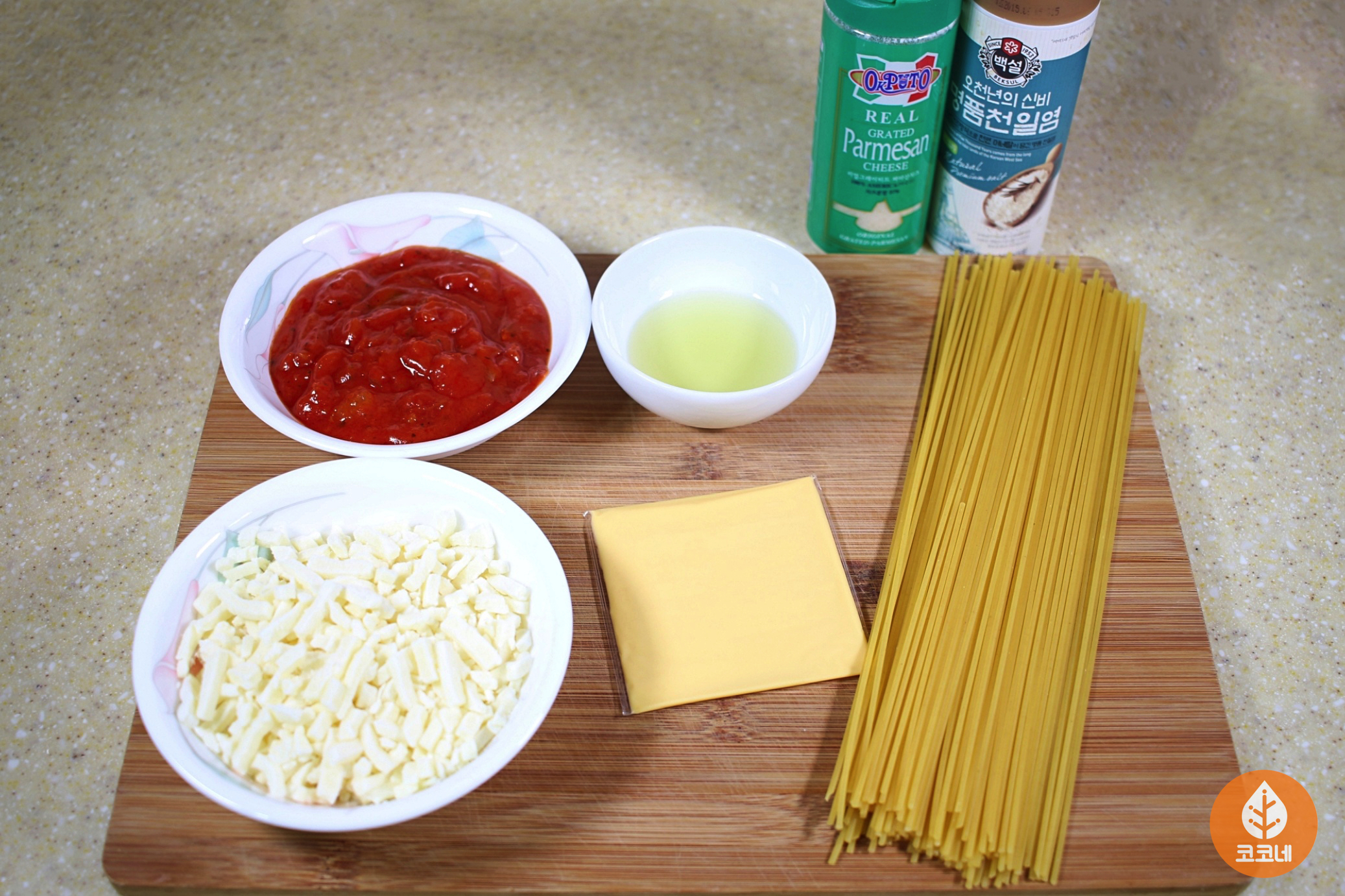 스파게티면, 토마토소스, 슬라이스치즈, 모짜렐라치즈,