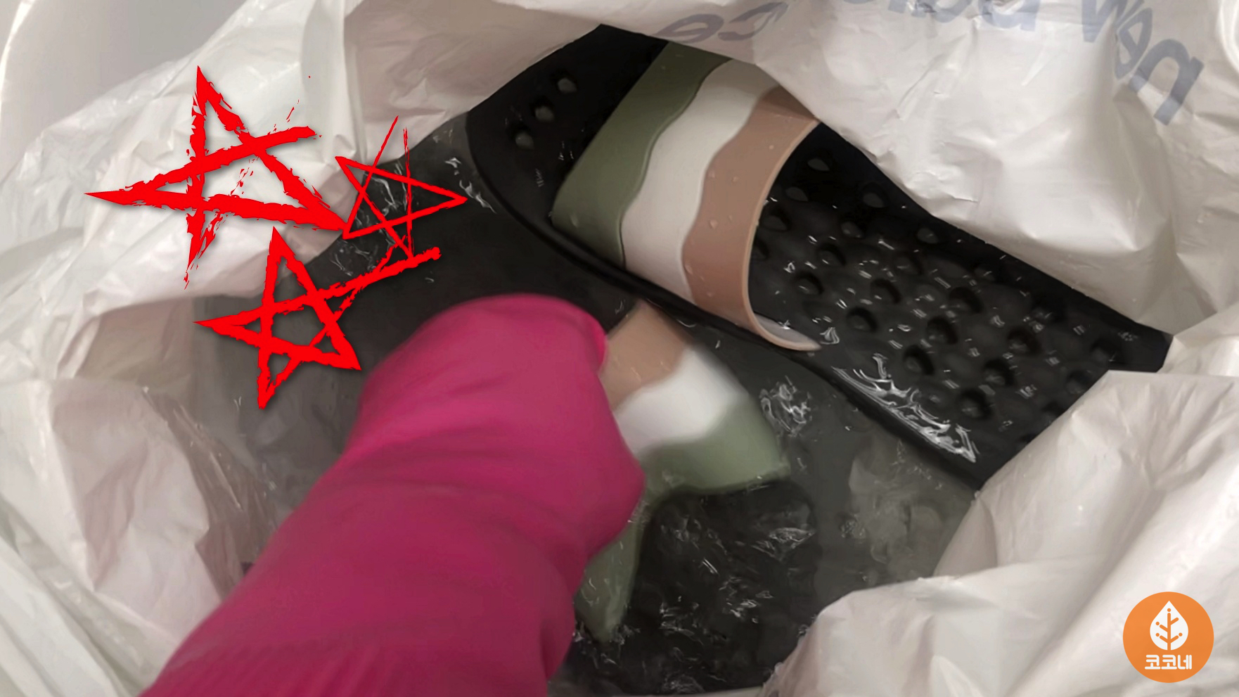 과탄산소다수에 헹구듯이 욕실화를 흔들어주고,
