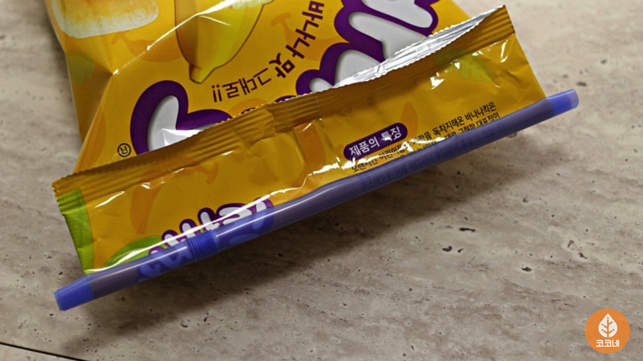 과자 봉지 윗부분에 빨대를 가로로 놓고