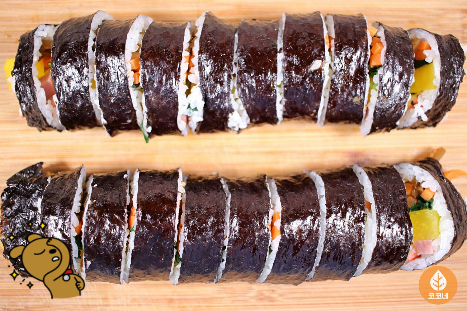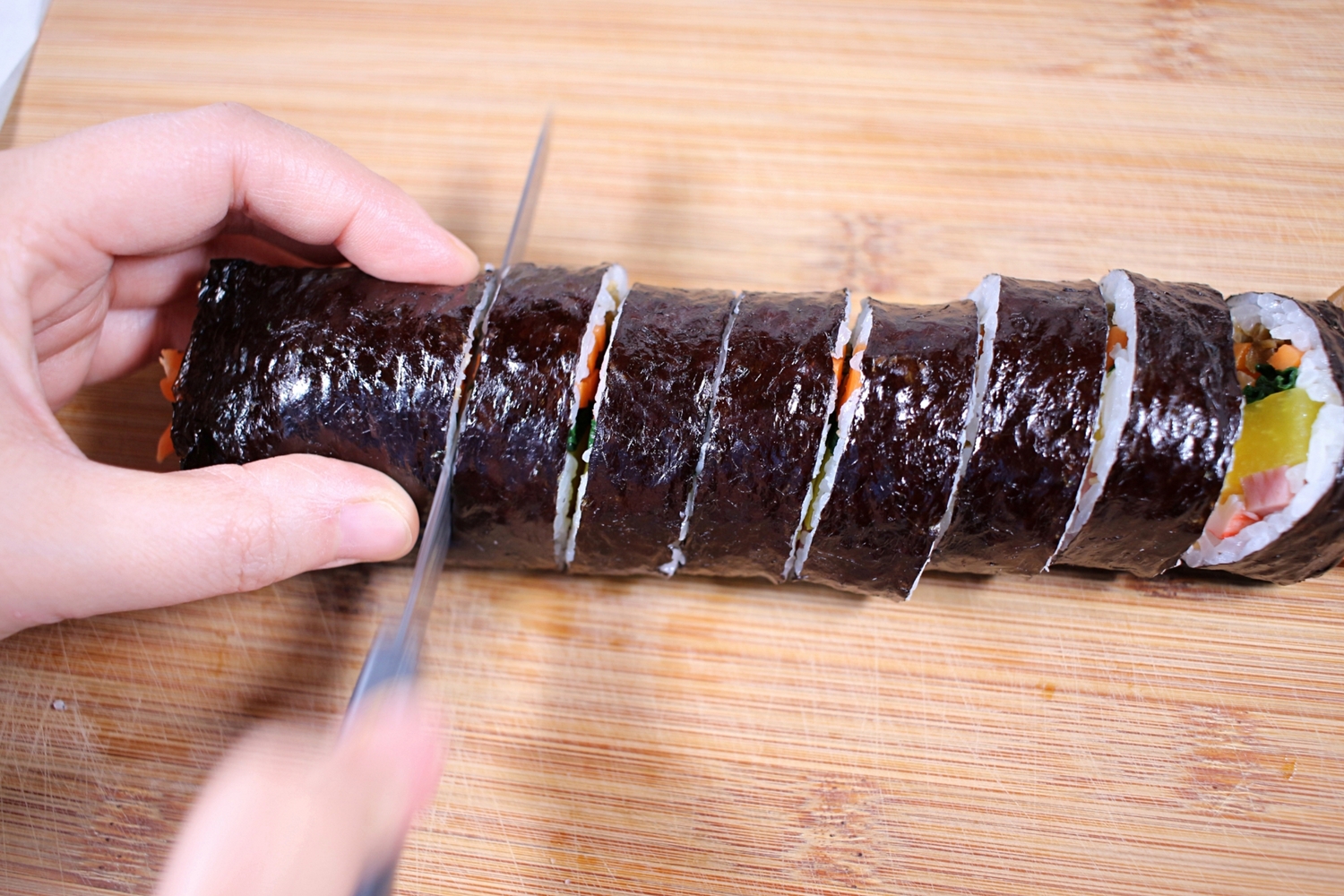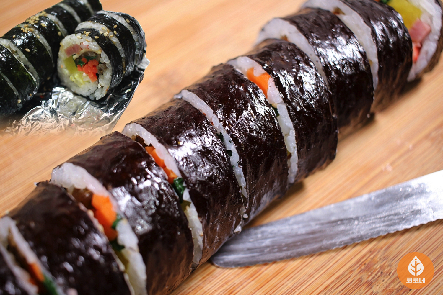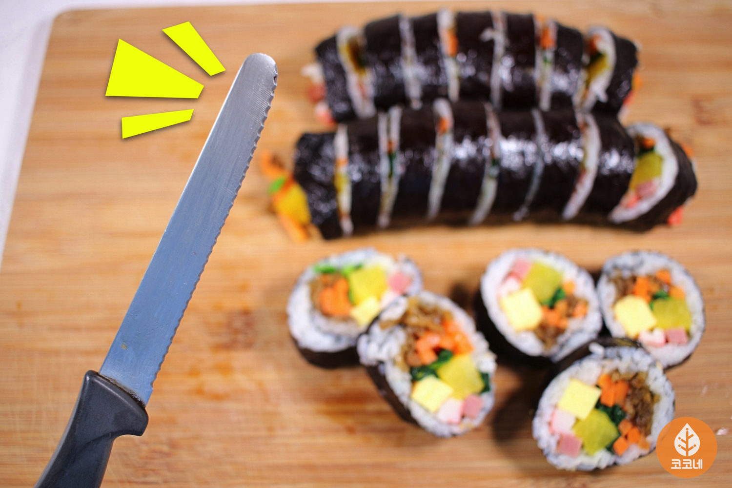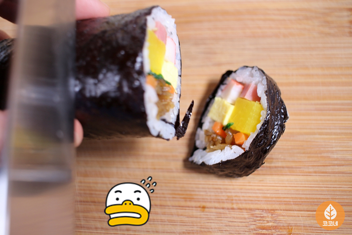 김밥 단면을 깔끔하게 커팅해서