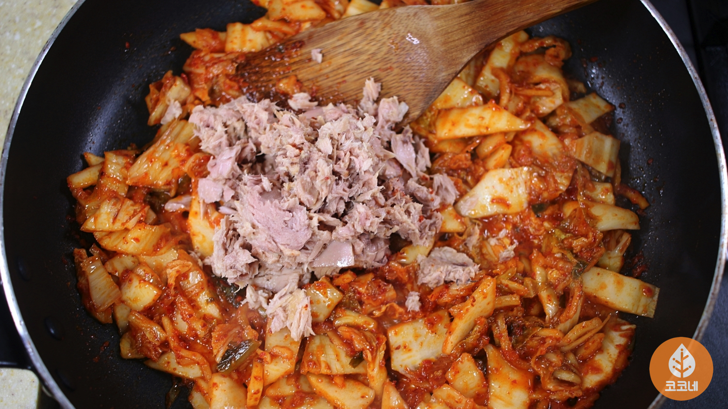기름기를 뺀 참치를 넣고 볶아주세요.