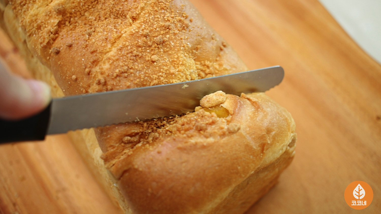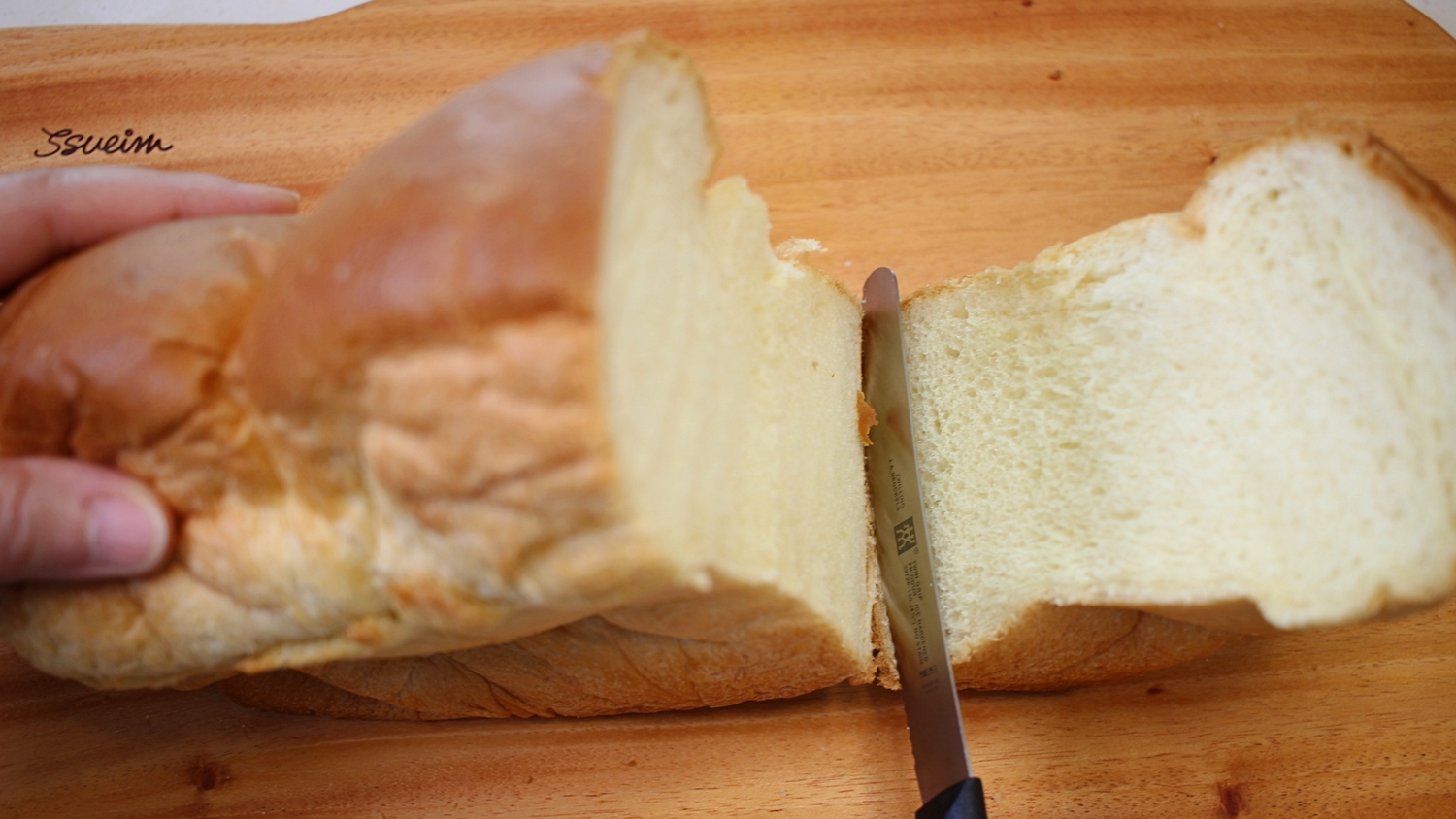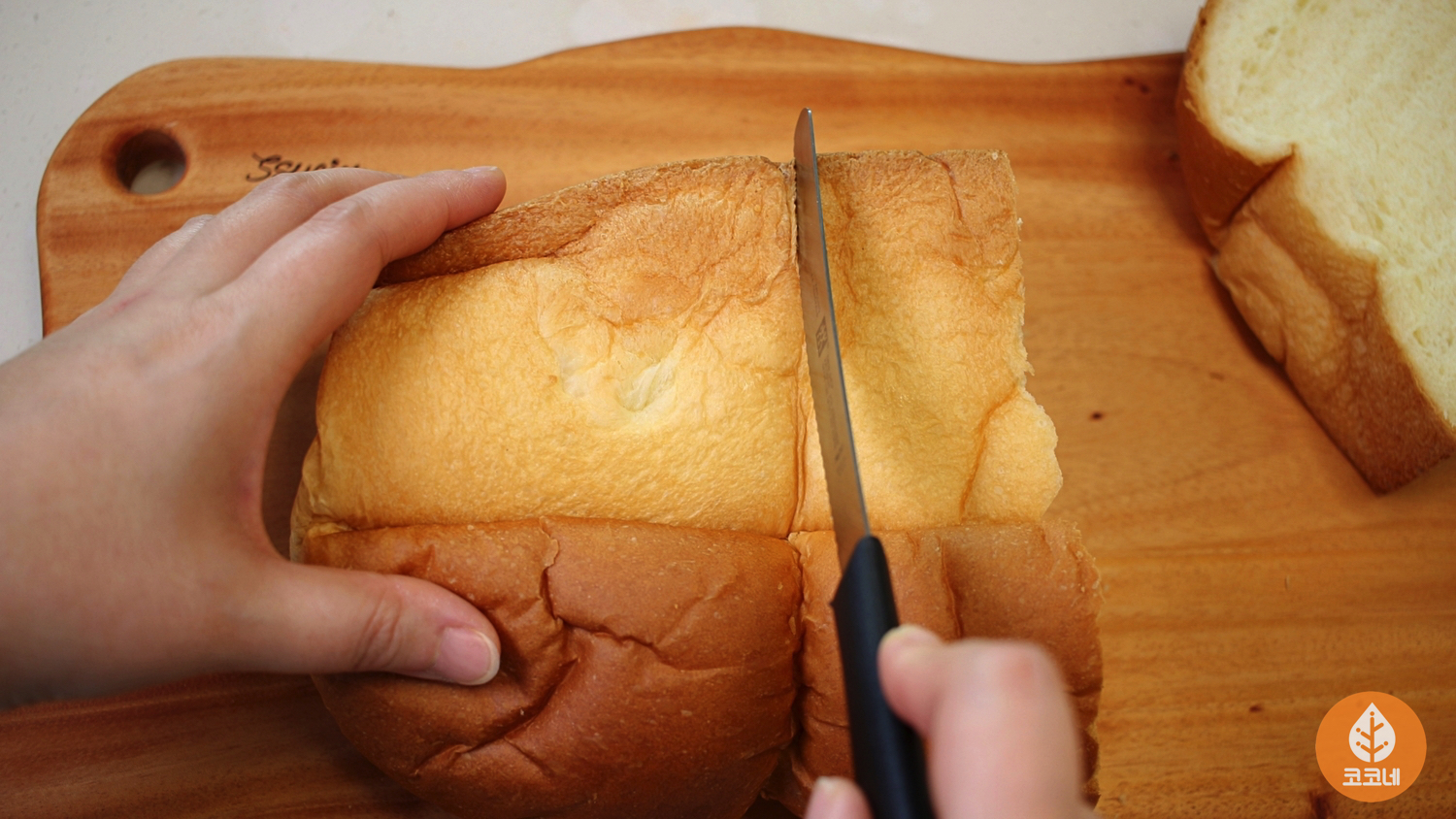 일반 식빵은 완전히 뒤집어서 잘라주시고요.