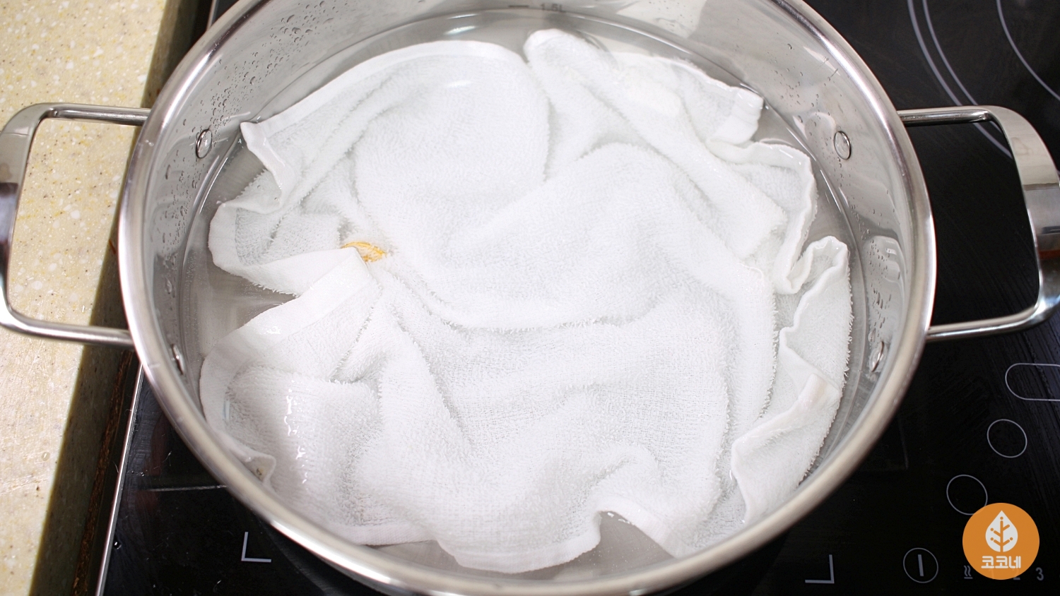 냄비 바닥에 깨끗한 행주를 깔아주세요.