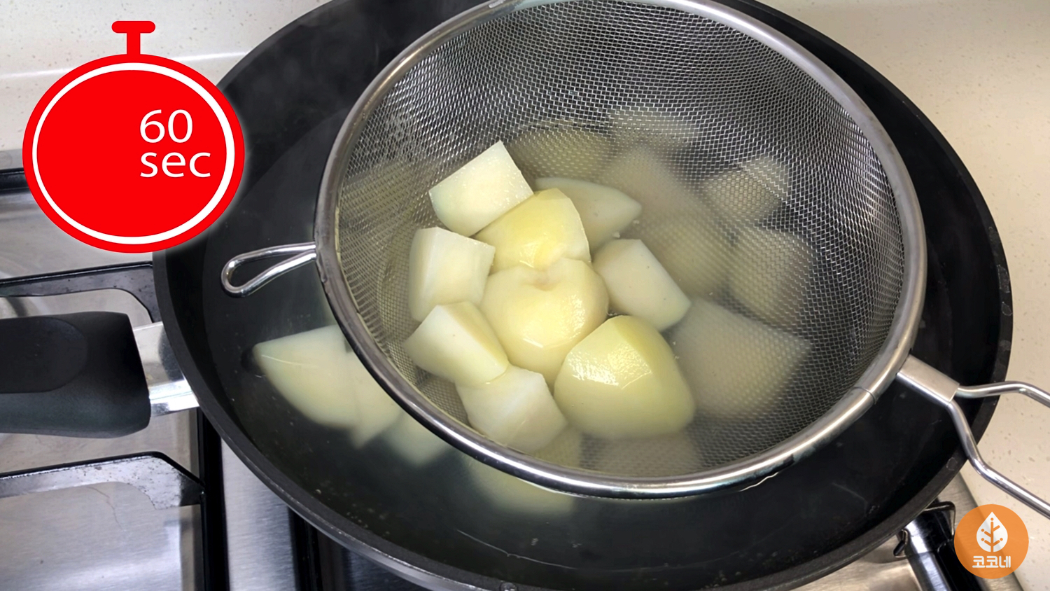 1분 뒤 감자를 꺼내서 물기를 빼주시고요.