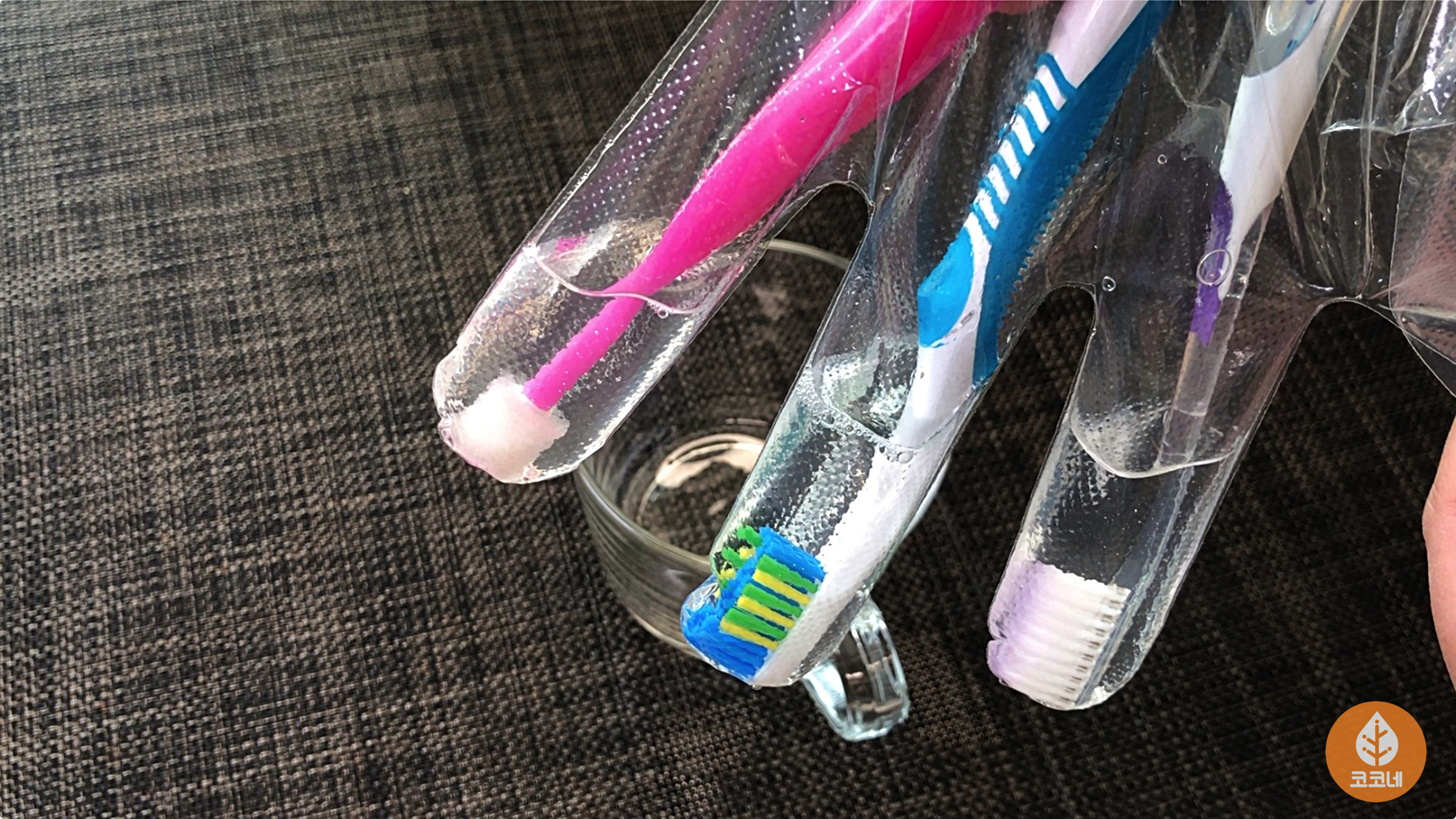 일회용장갑에 칫솔을 하나씩 넣어주시고요.