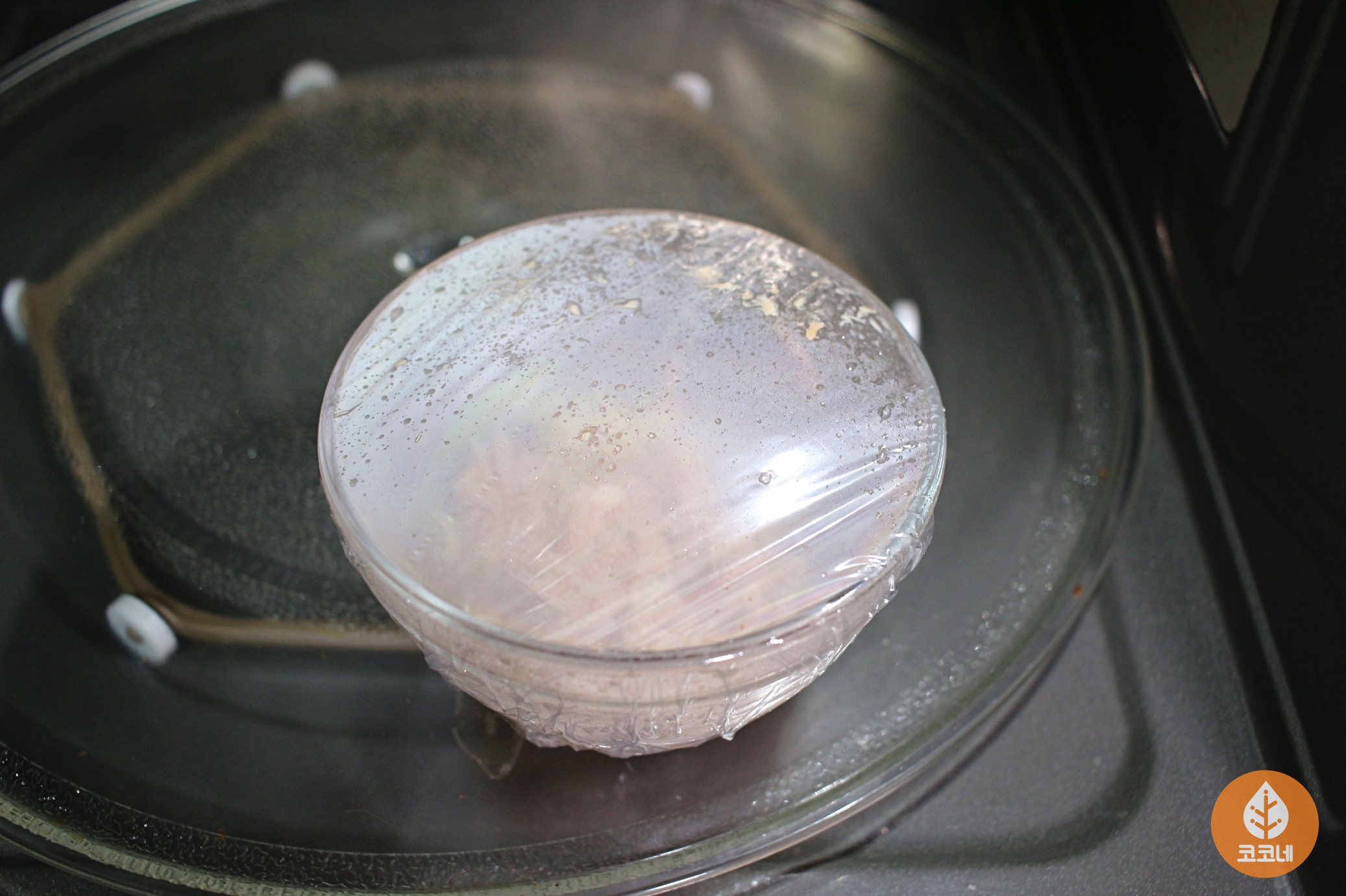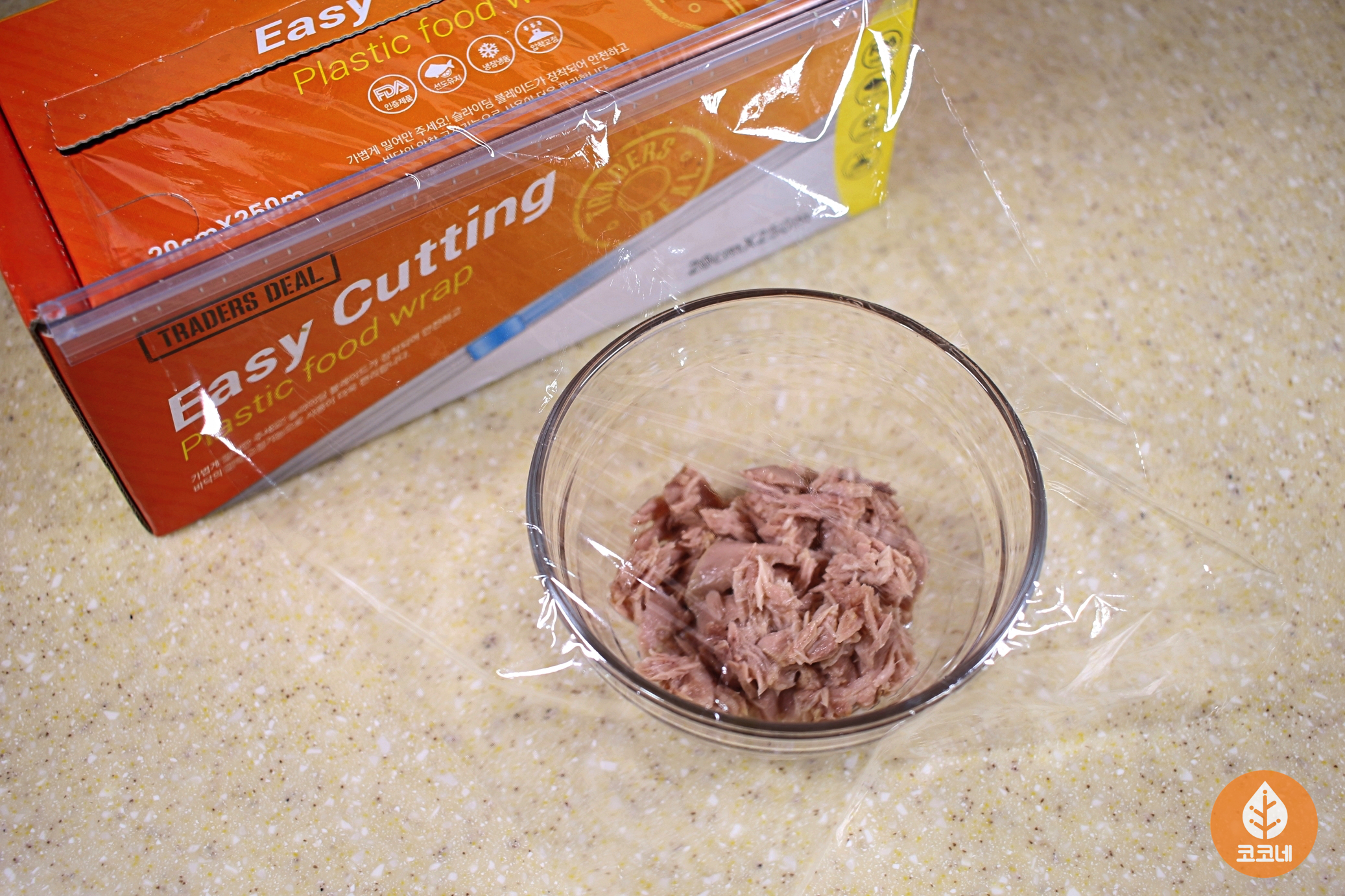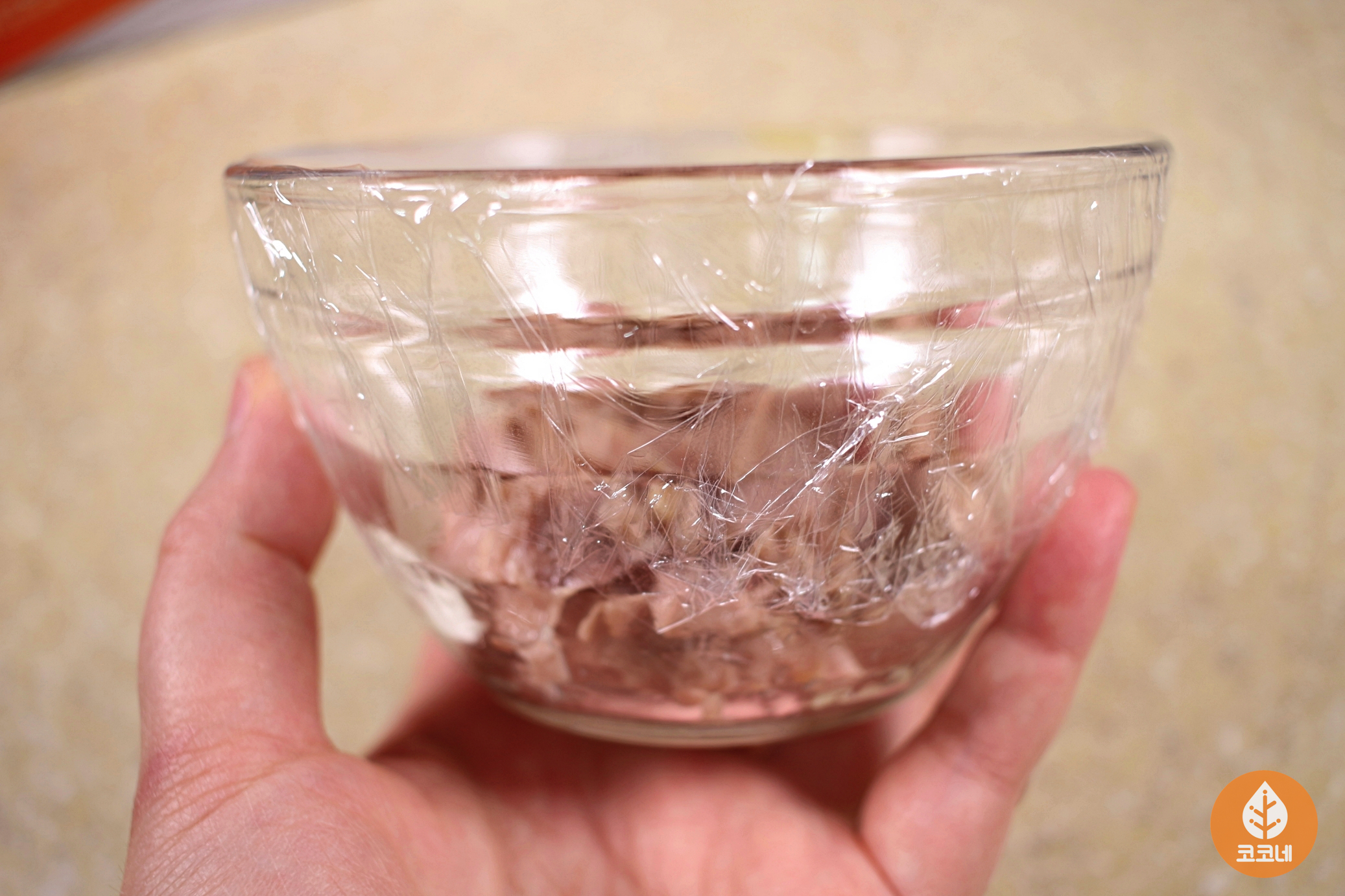 그다음 밀폐용기에 조리용 랩을 씌워주세요.