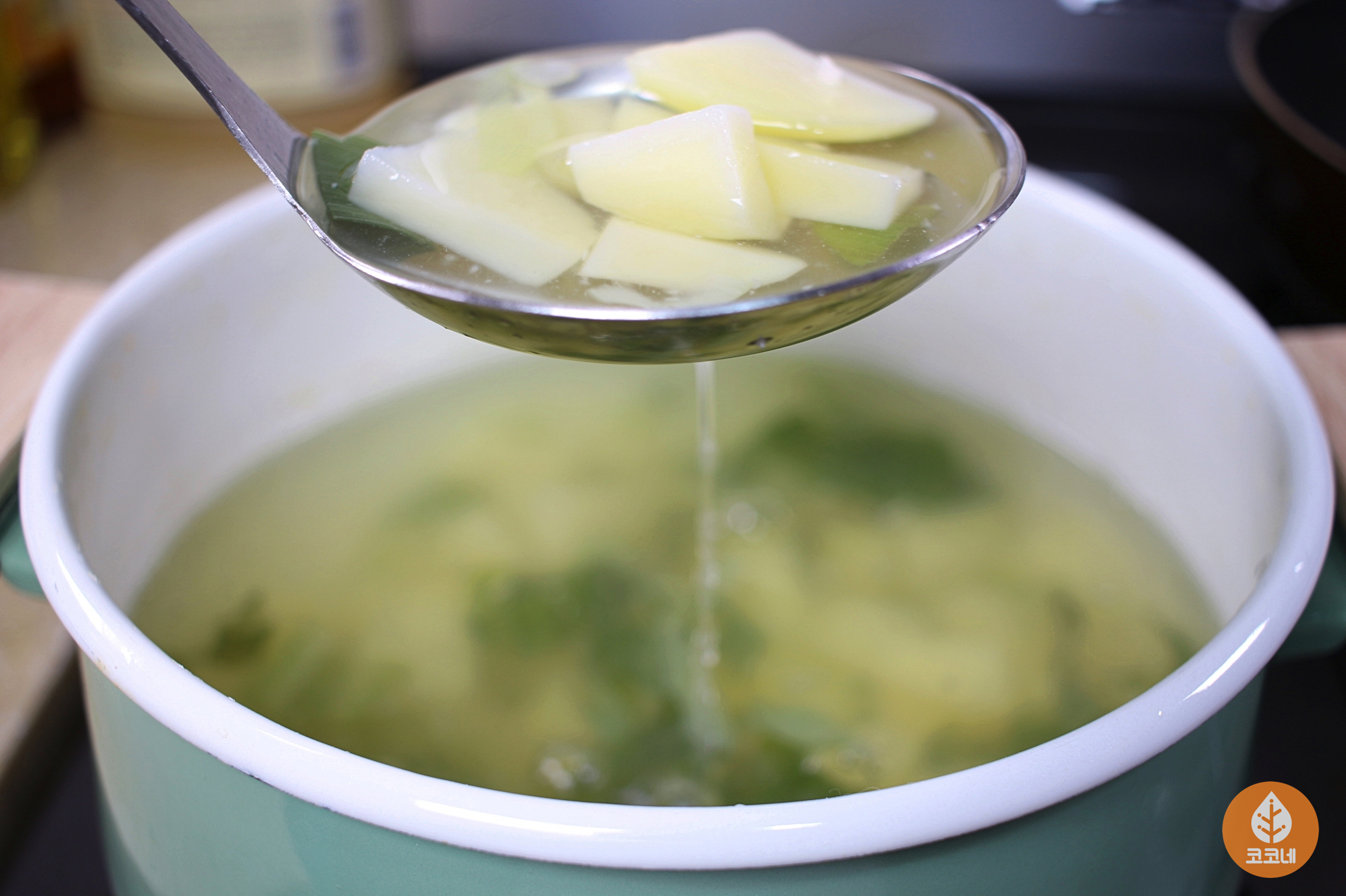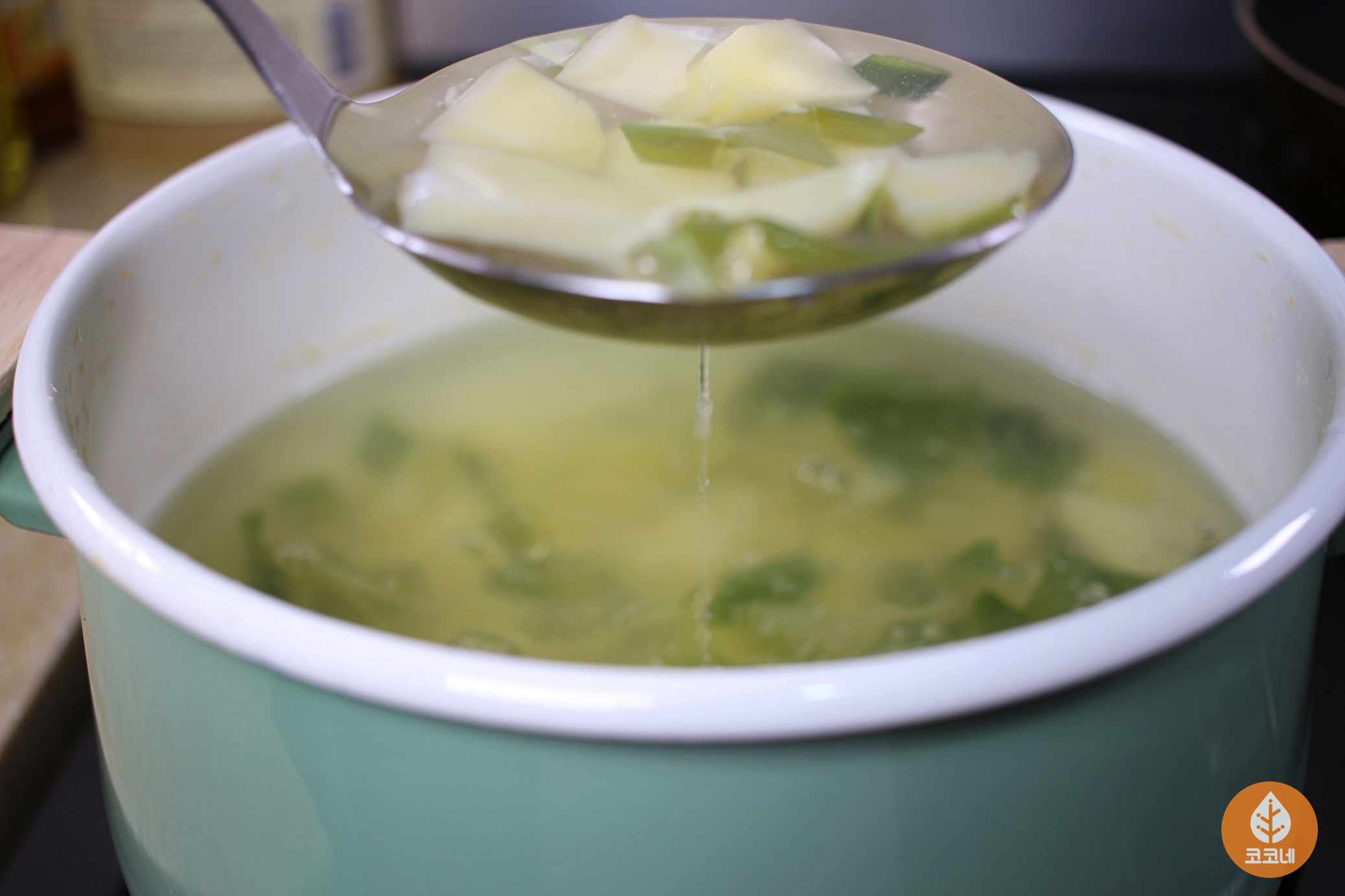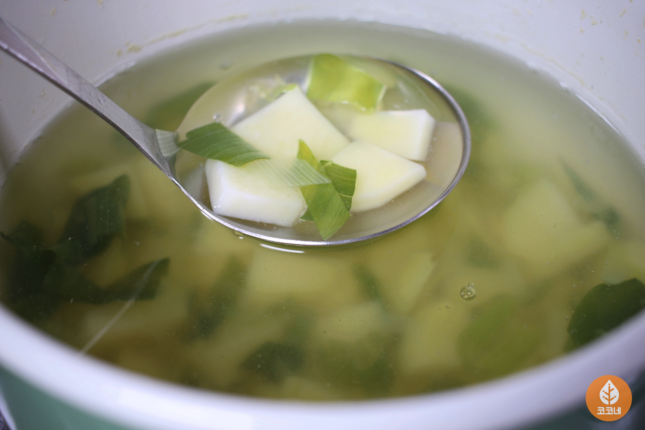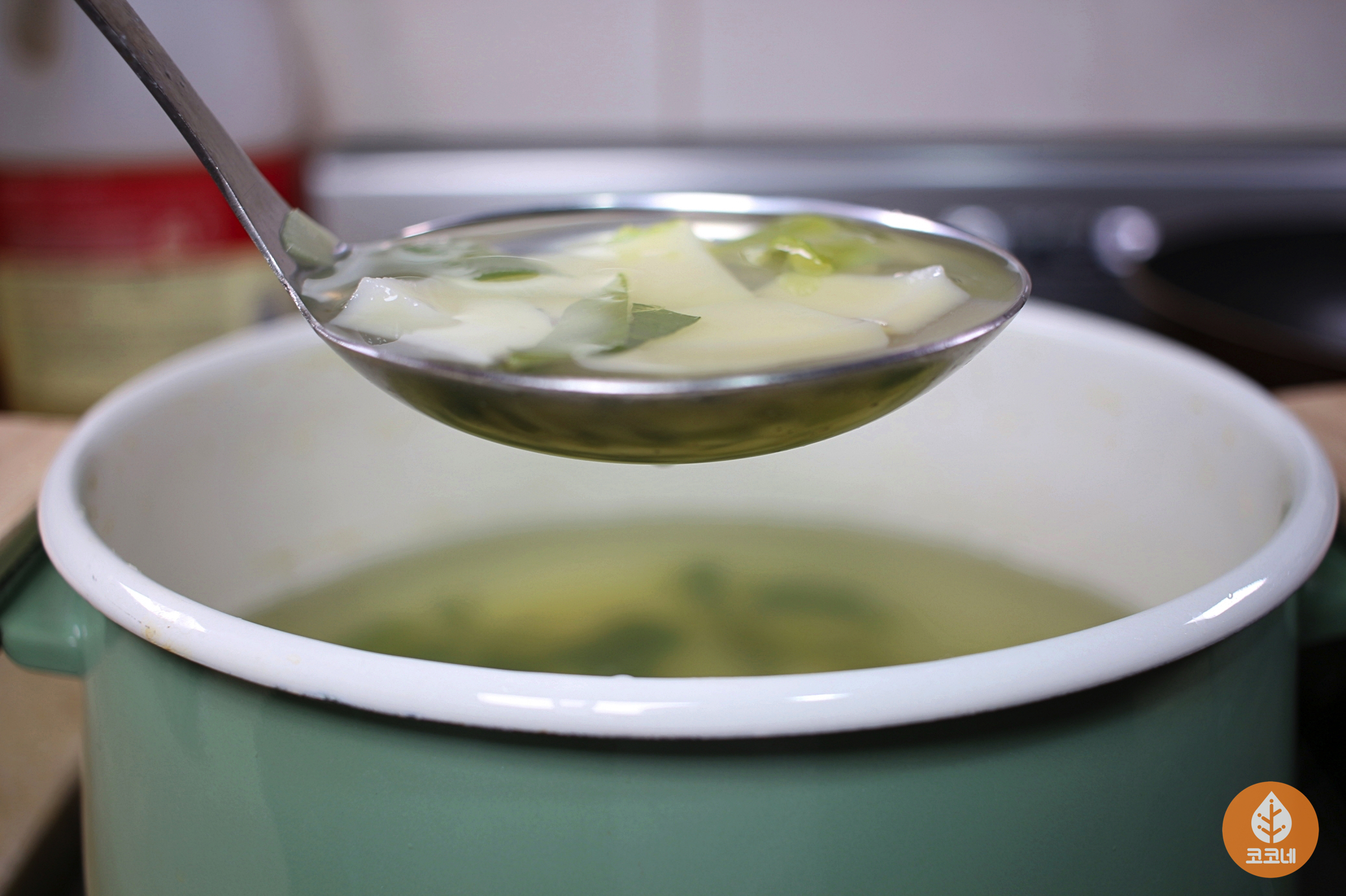 국자바닥을 국물에 살짝 담갔다가 들면