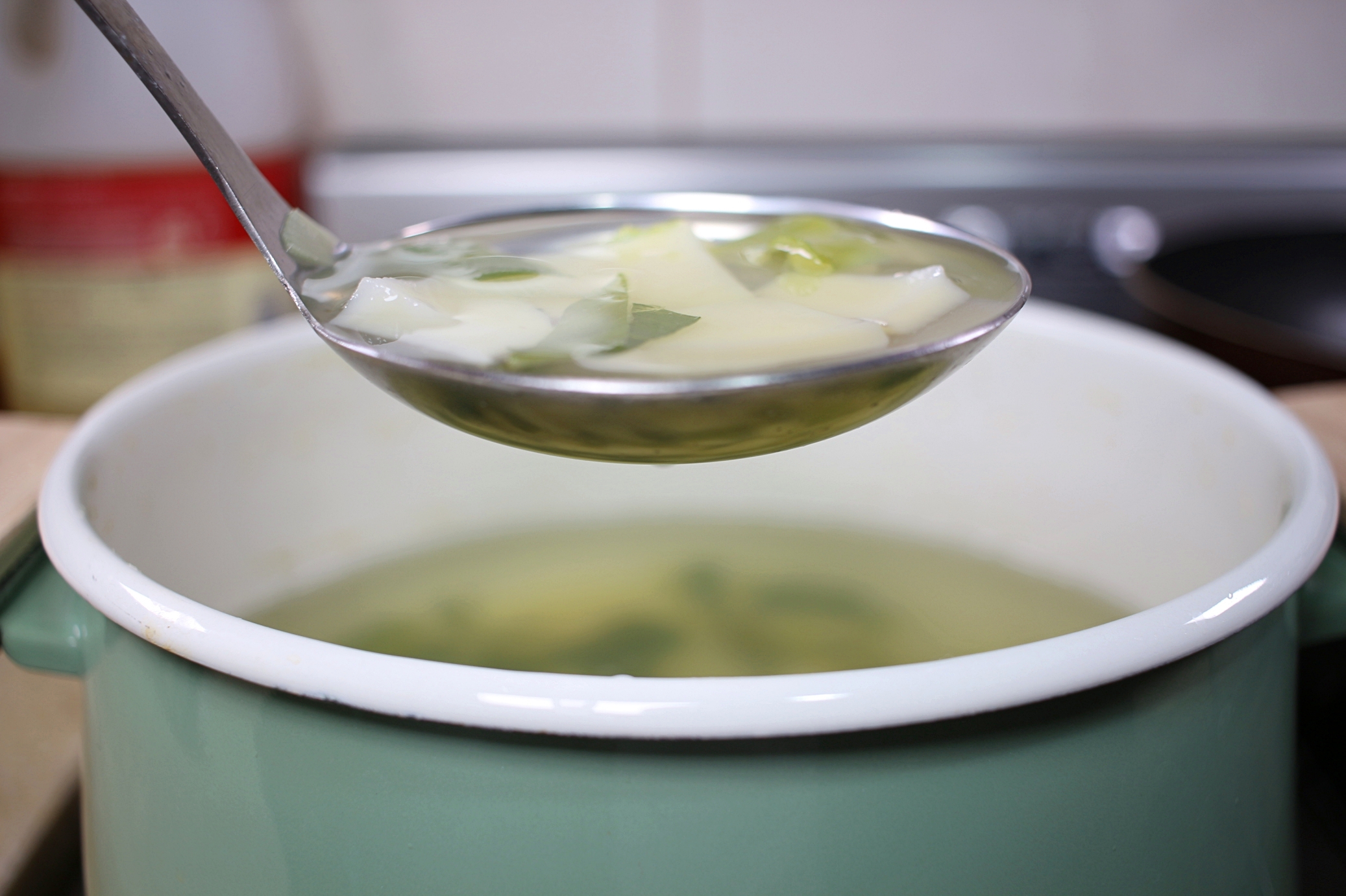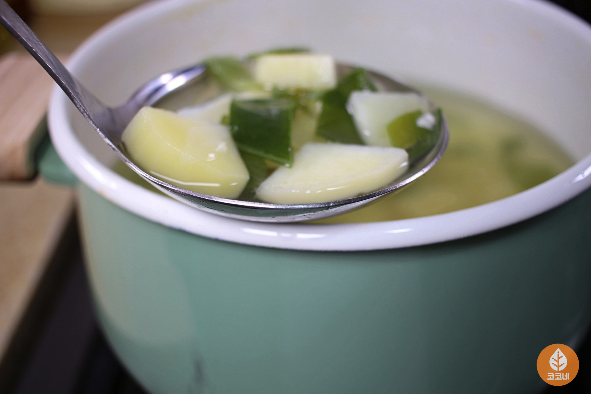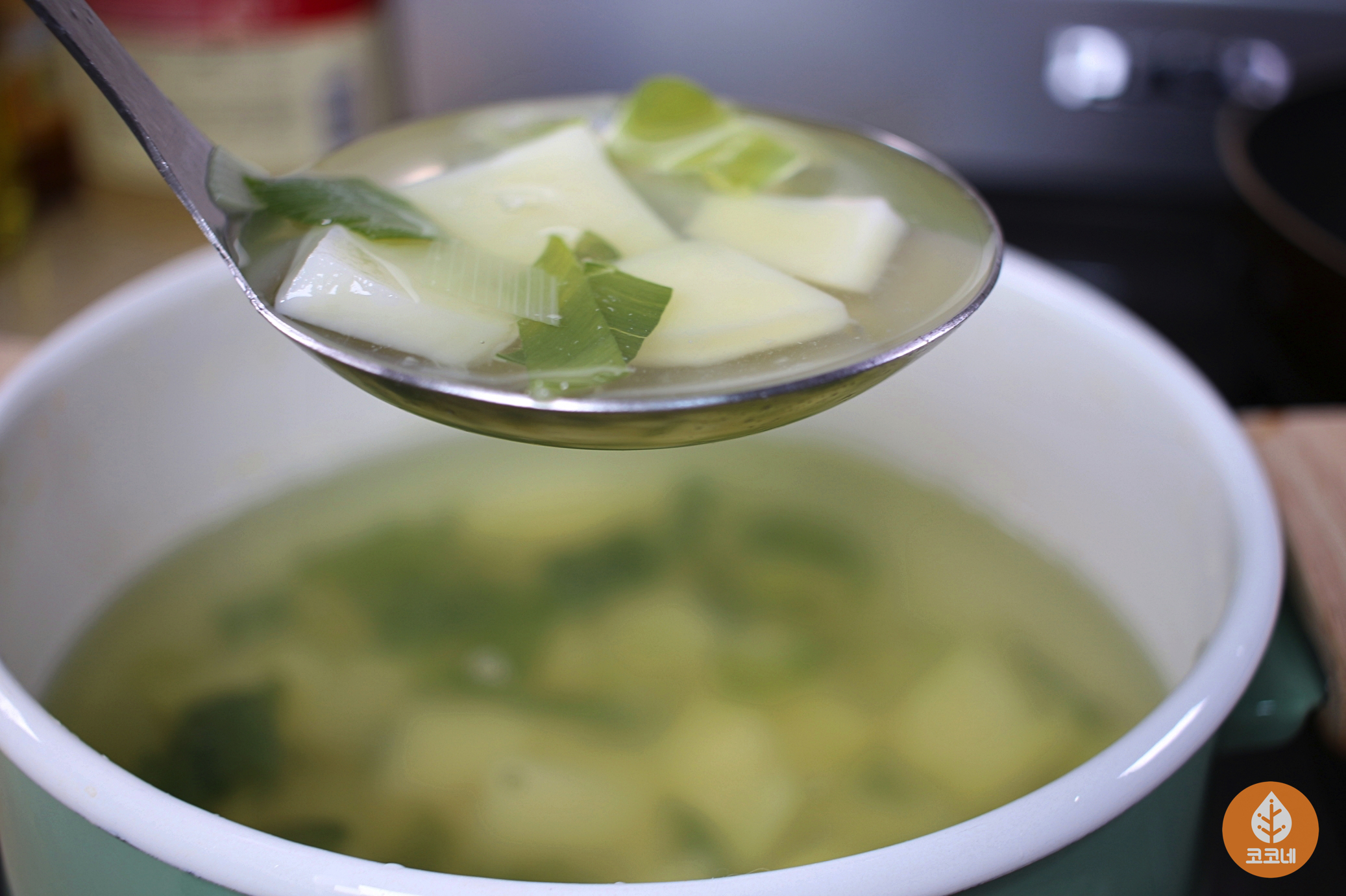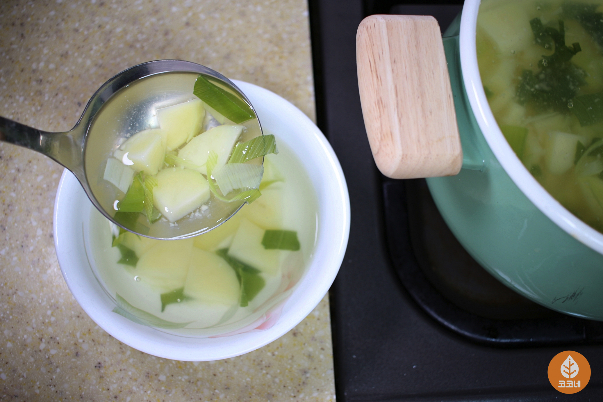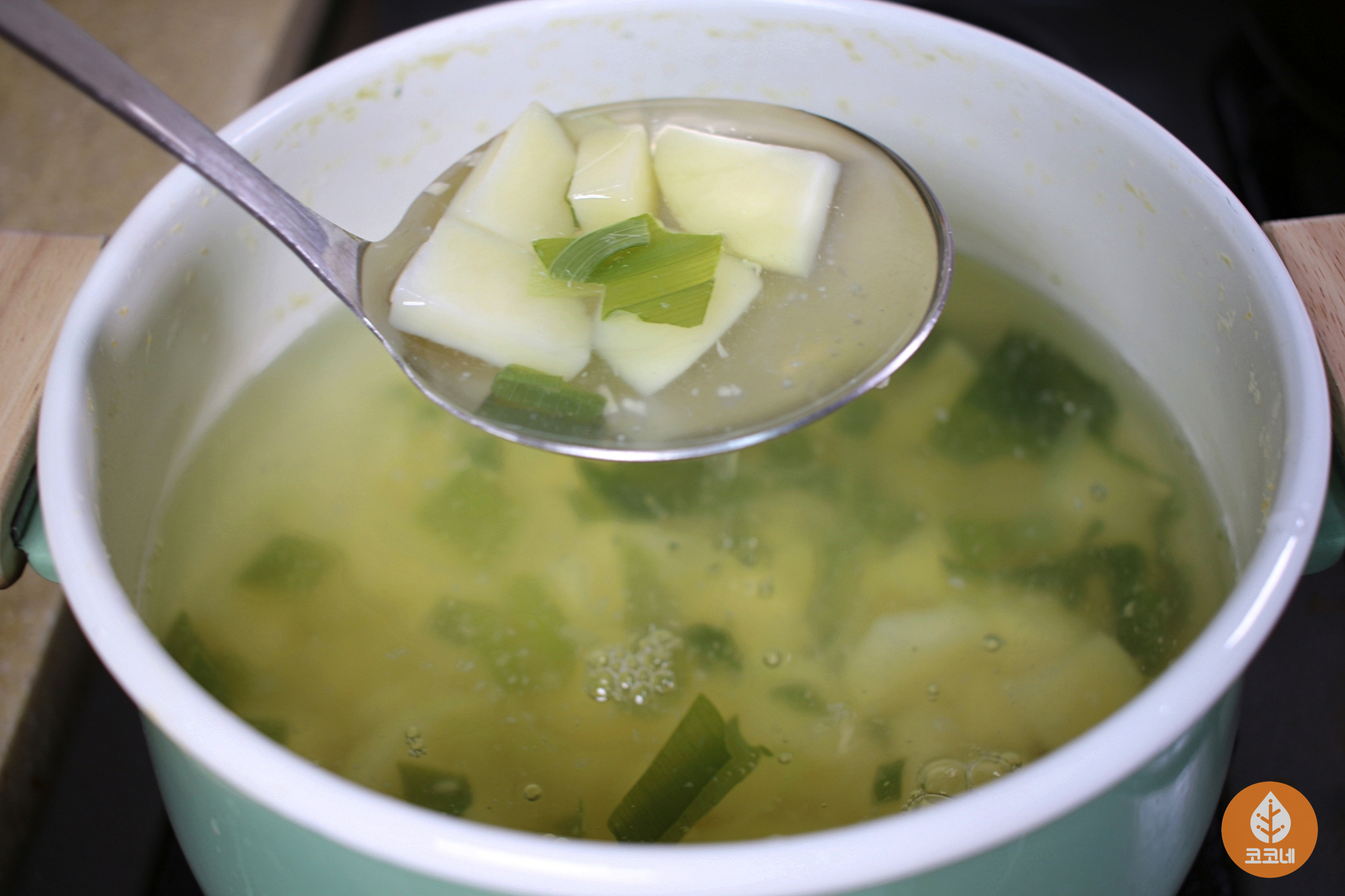 국자바닥을 국물에 살짝 담갔다가 들면