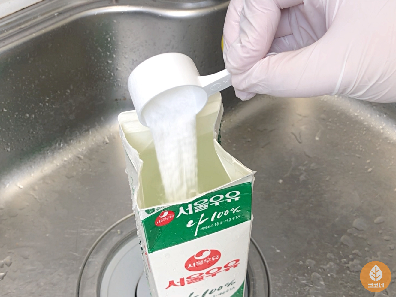 우유갑에 물 채우고 베이킹소다 한숟가락 풀어서