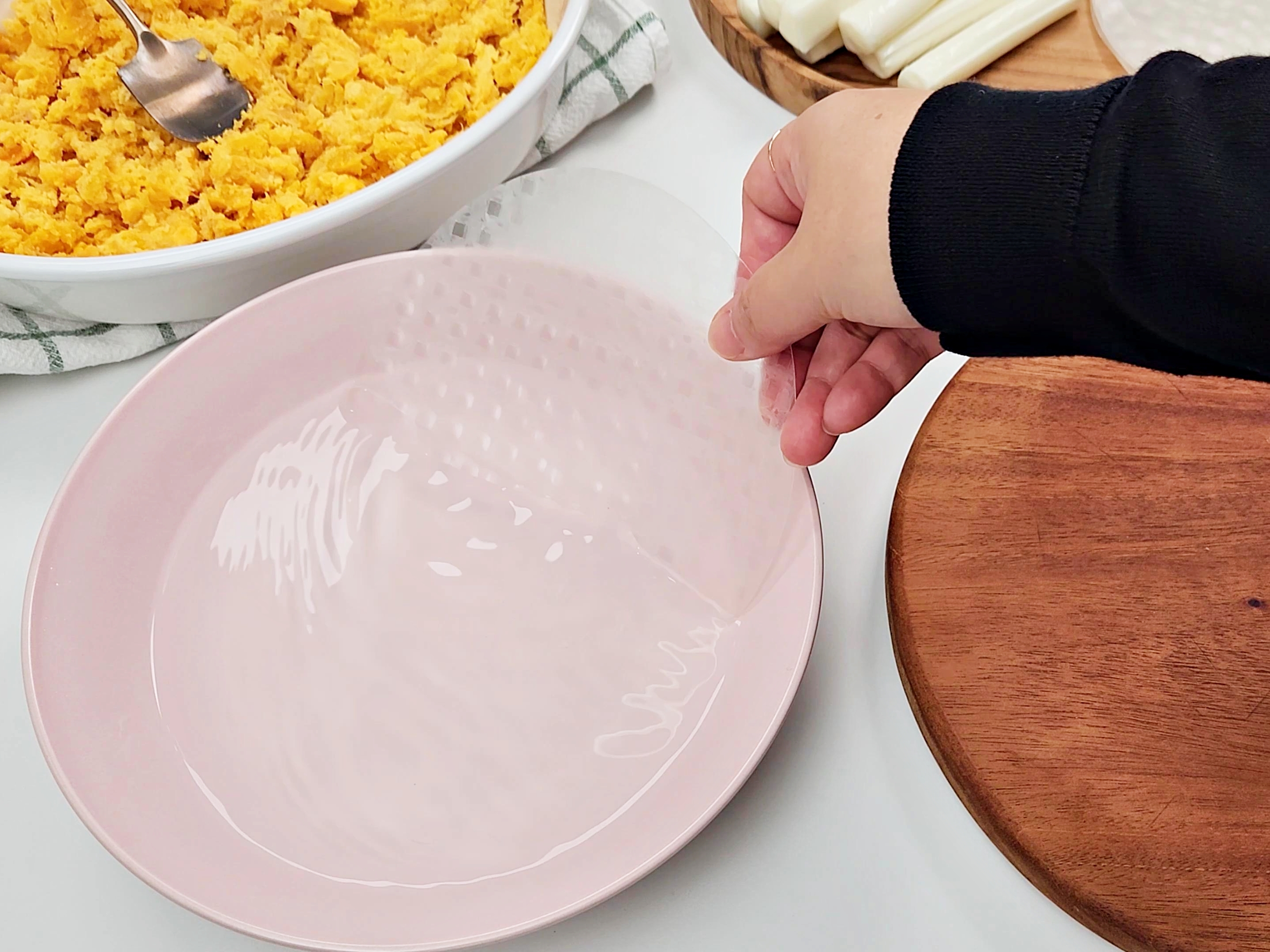 라이스페이퍼 위에 스트링치즈, 으깬 고구마를 올려요.