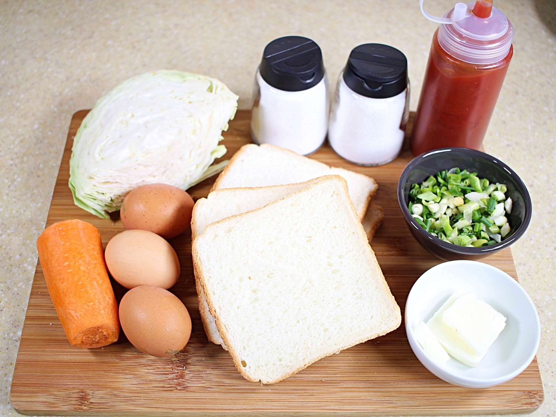 재료는 식빵, 달걀, 양배추, 당근, 쪽파