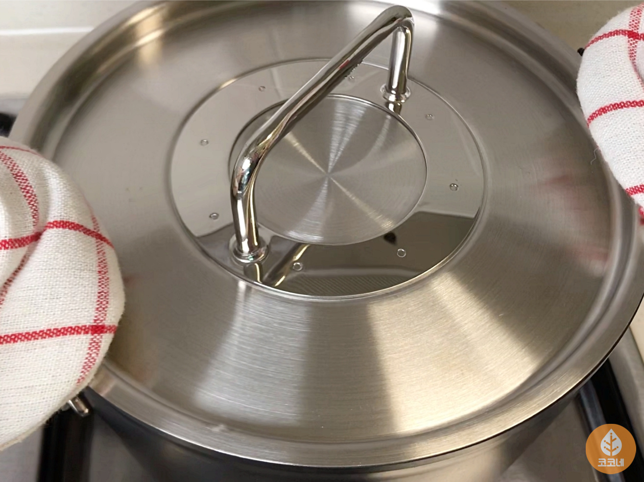 그다음 냄비 뚜껑을 닫고 살살 흔들어서