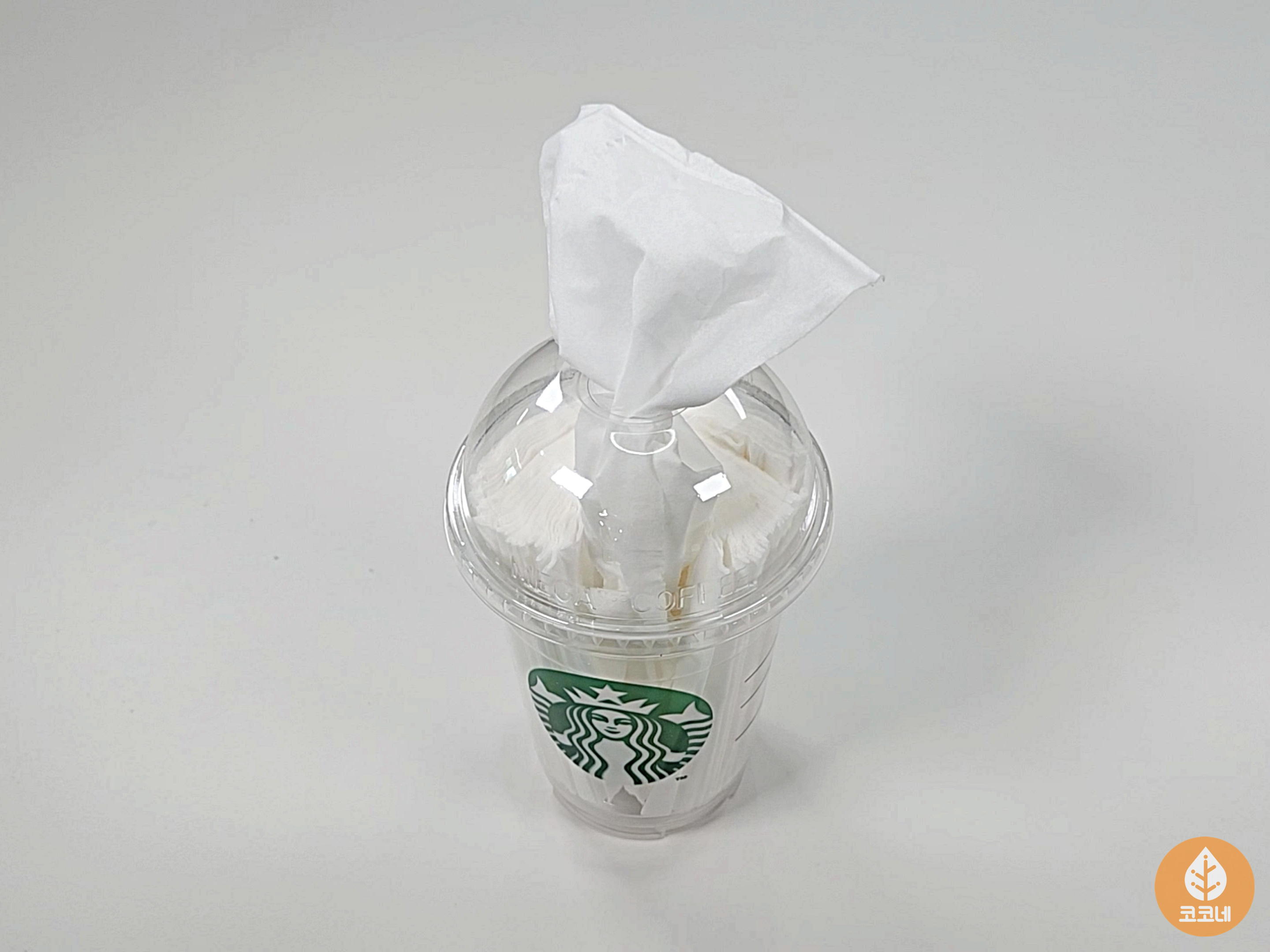 또, 자른 티슈 반절을 일회용아이스컵에 담으면