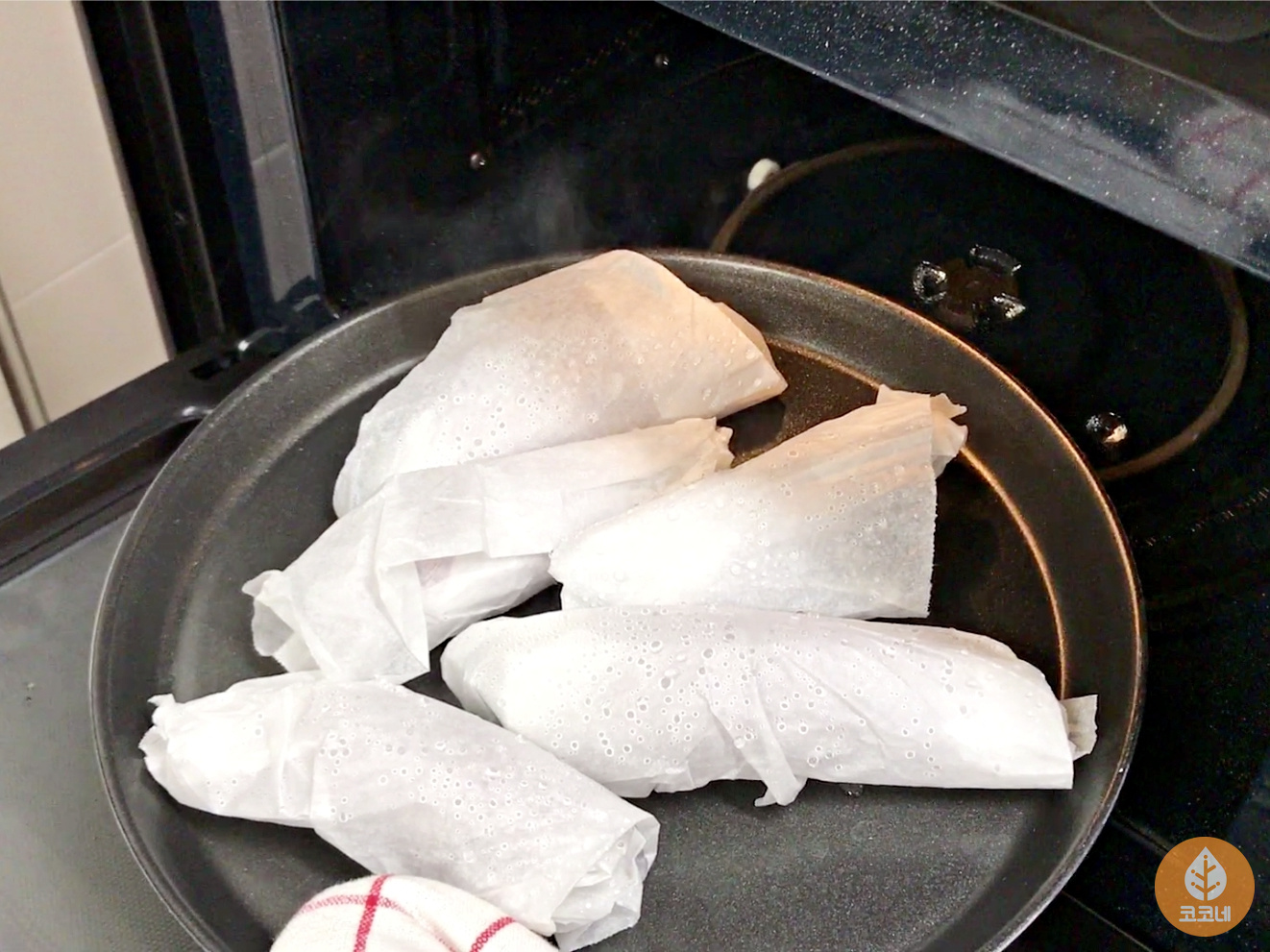 껍질 벗기지 않은 상태로 종이호일로 감싸주세요.