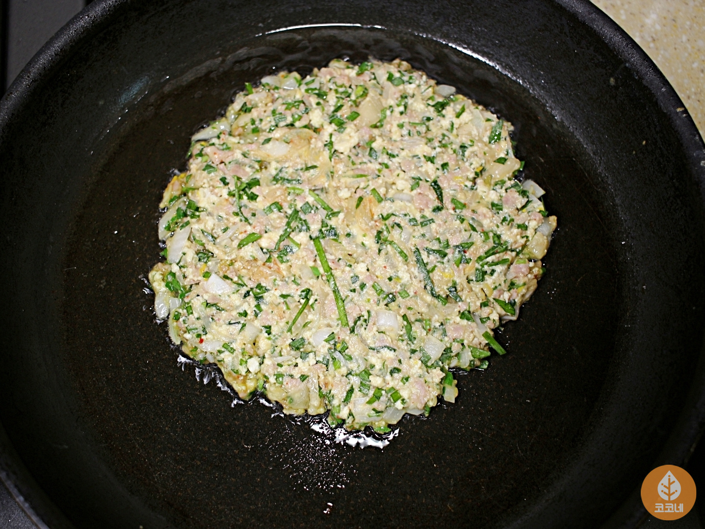 반죽 한국자 떠서 노릇노릇하게 구워주세요.