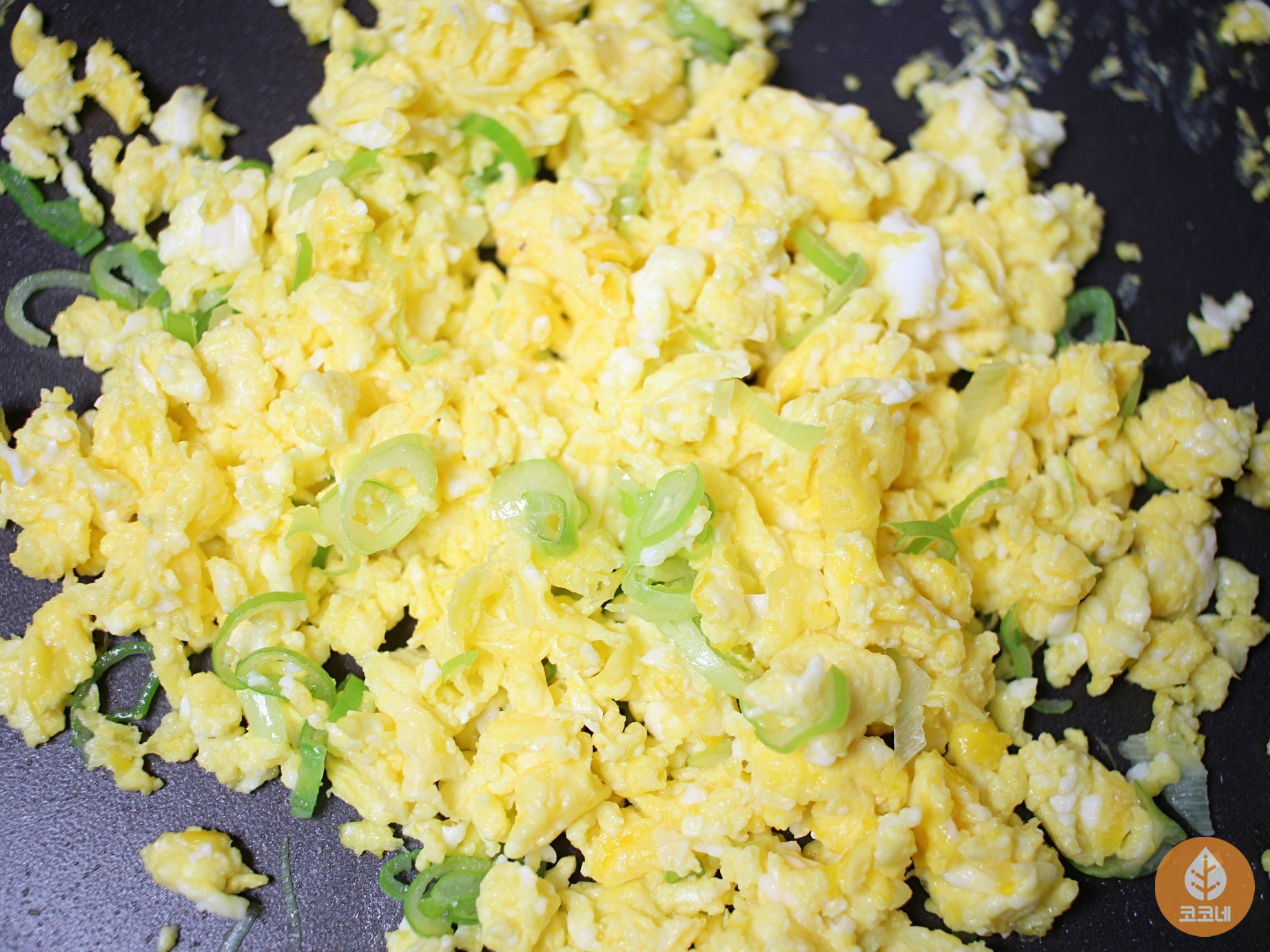 잘게 썬 대파 한줌 넣어서 후다닥 볶아주세요.