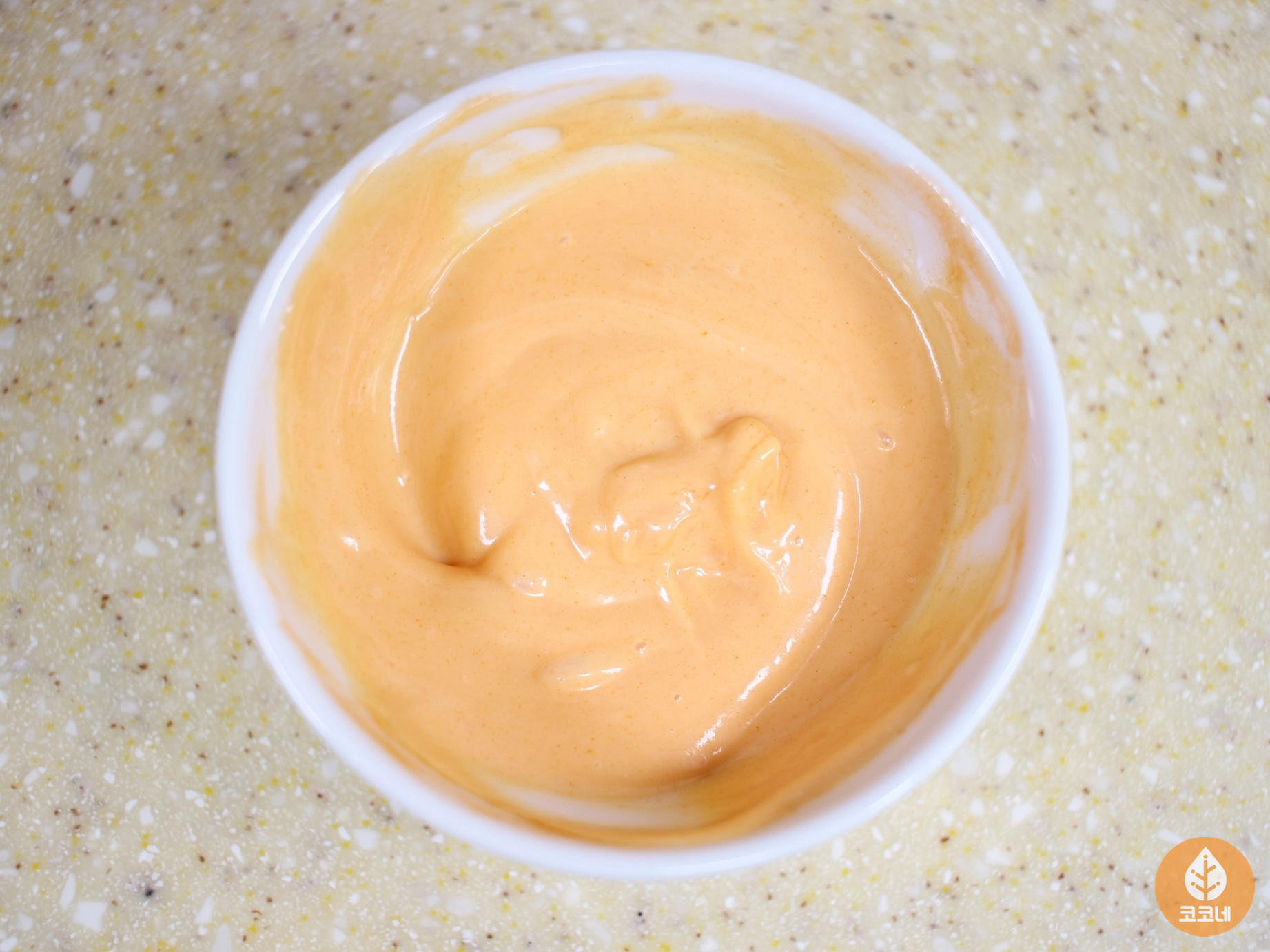 소스는 마요네즈2, 스리라차소스1 섞어서 만들었어요.
