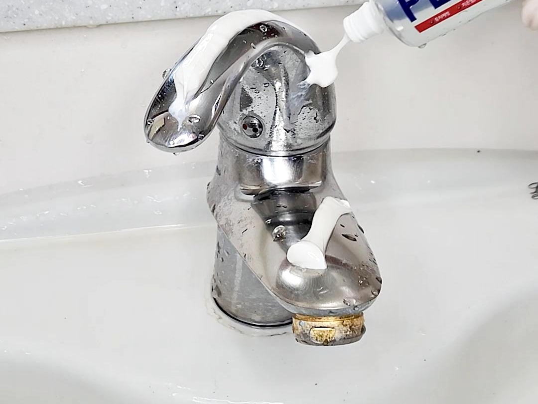 먼저 수도꼭지 표면에 치약을 골고루 펴 바르시고요.