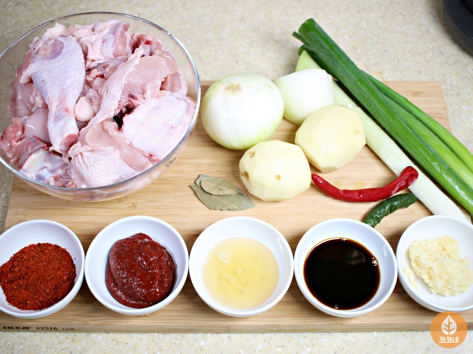 재료는 닭, 감자, 양파, 대파, 청양고추, 월계수잎,