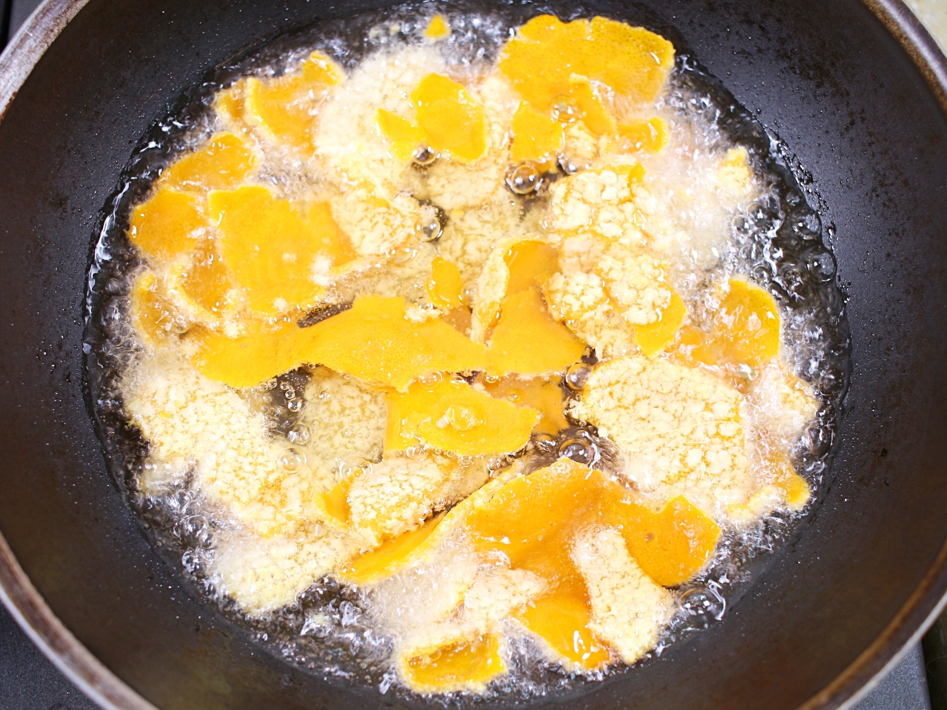 서서히 온도가 올라가면서 귤껍질이 바삭하게 튀겨져요.
