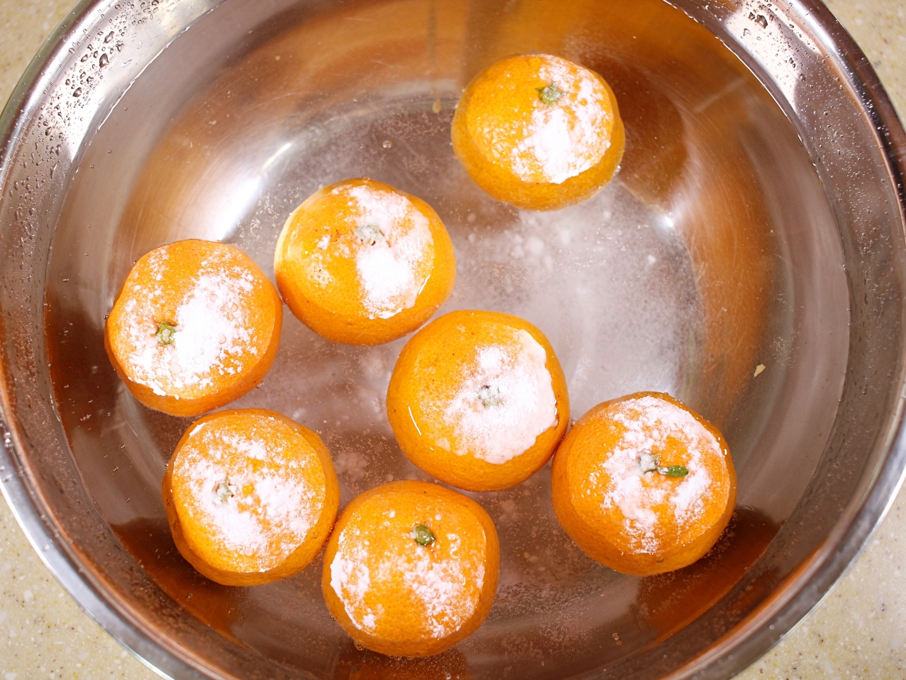 식초가 귤껍질에 잘 스며들도록 하는 과정이에요.