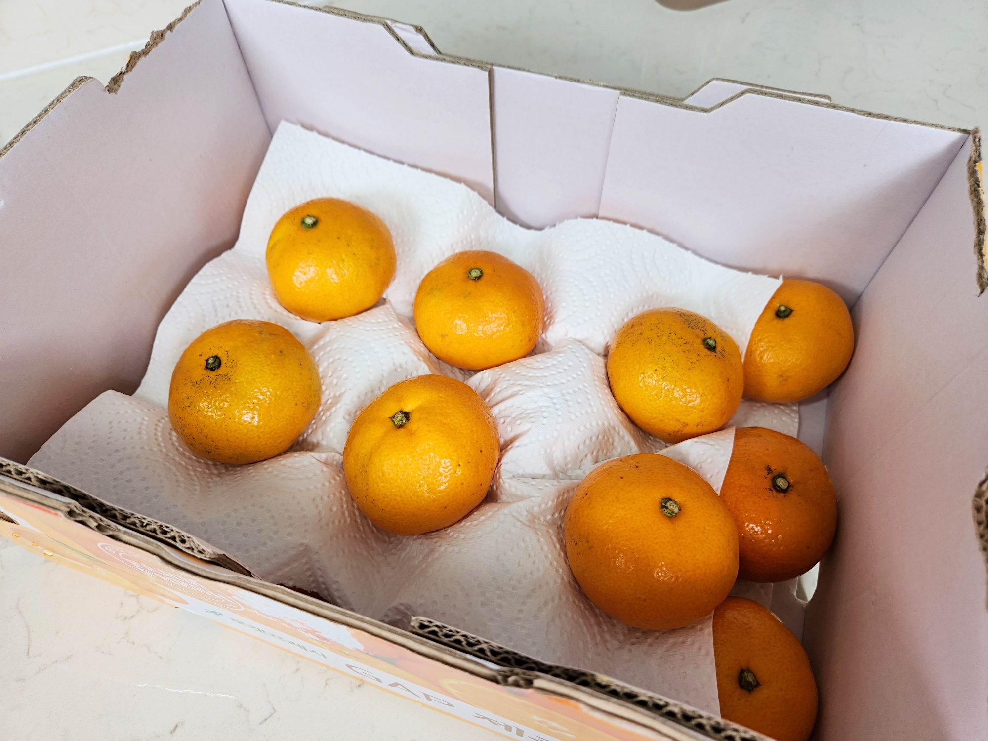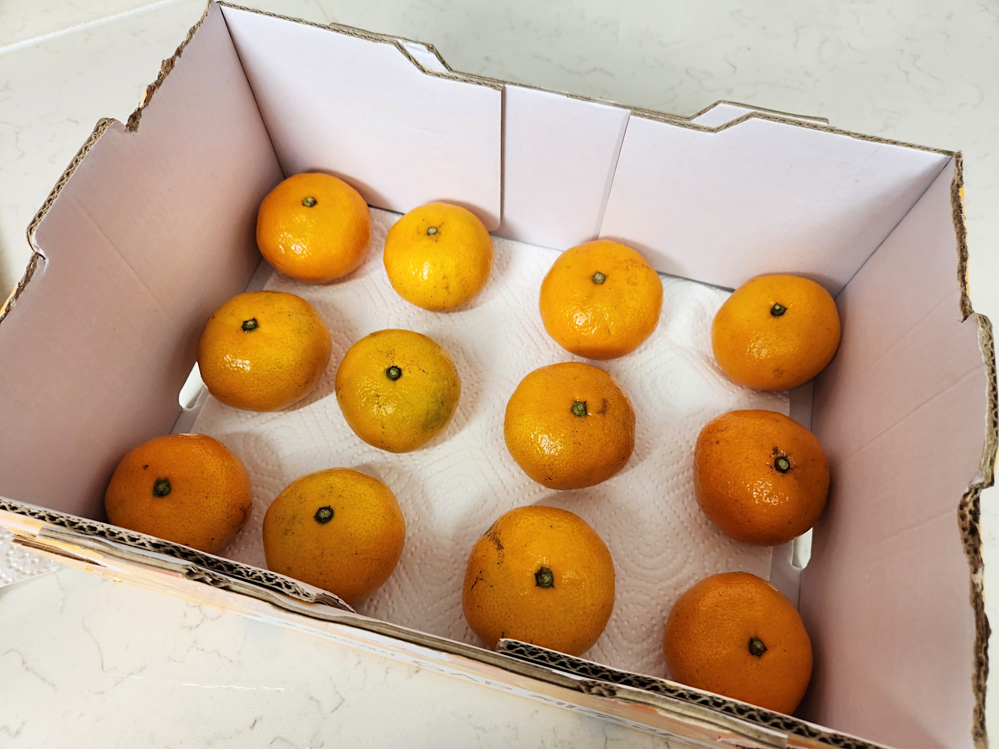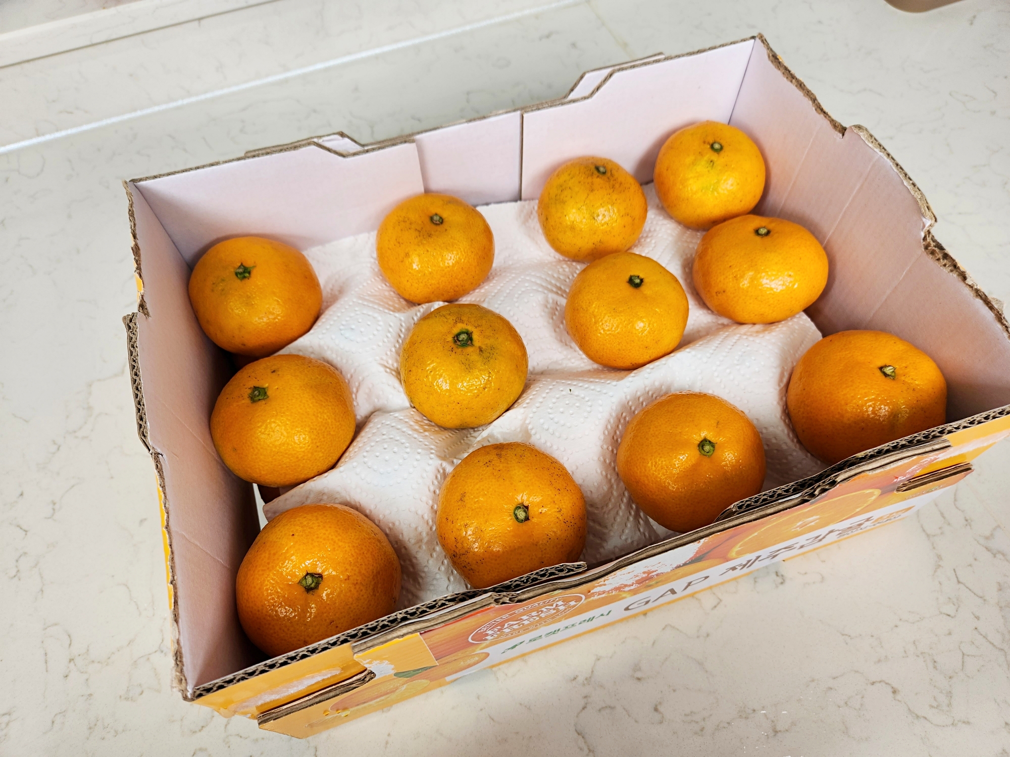 그다음 귤 상자 안에 키친타월을 깔고