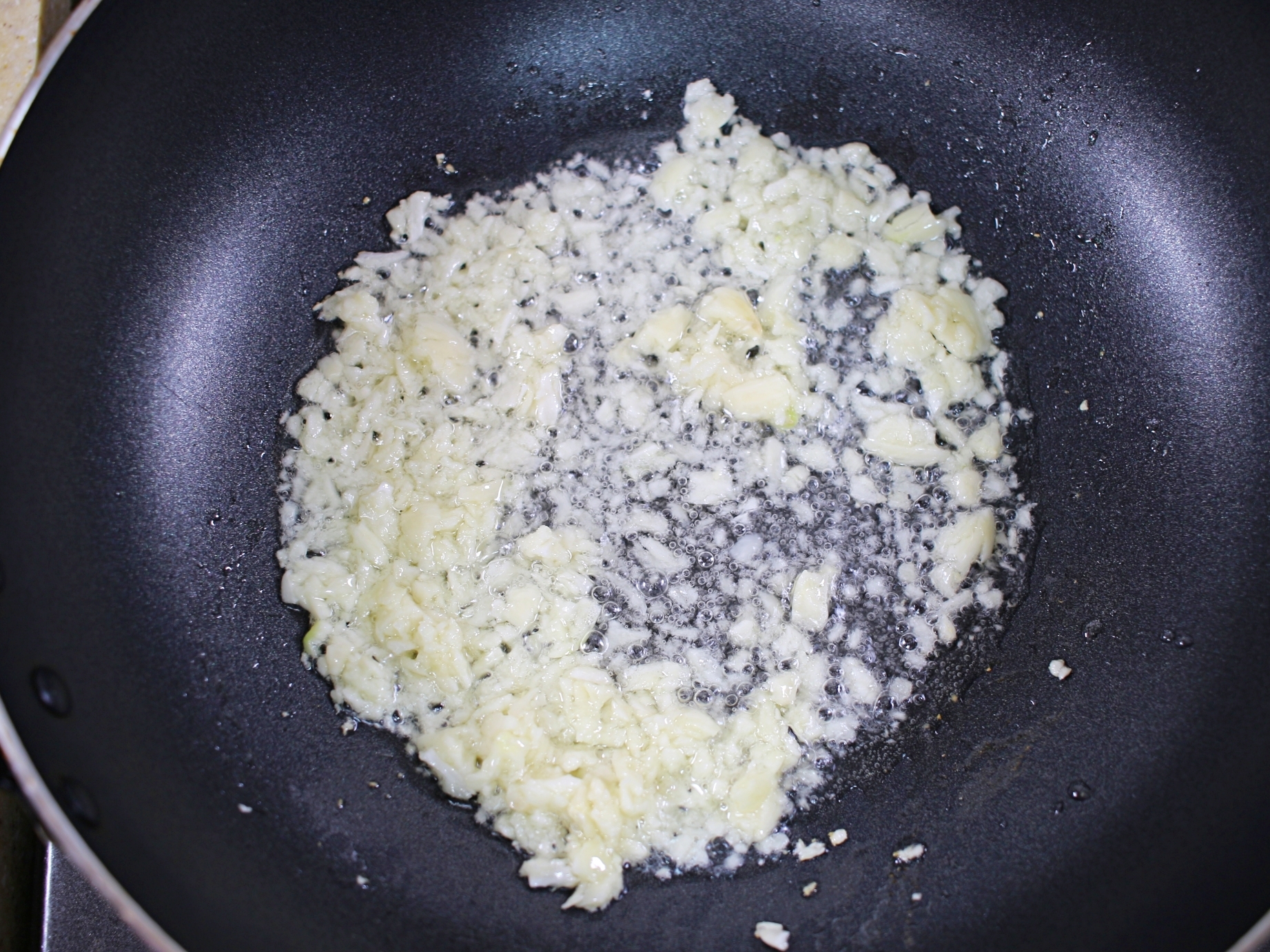 팬에 식용유 4큰술, 다진 마늘 2큰술을 넣고