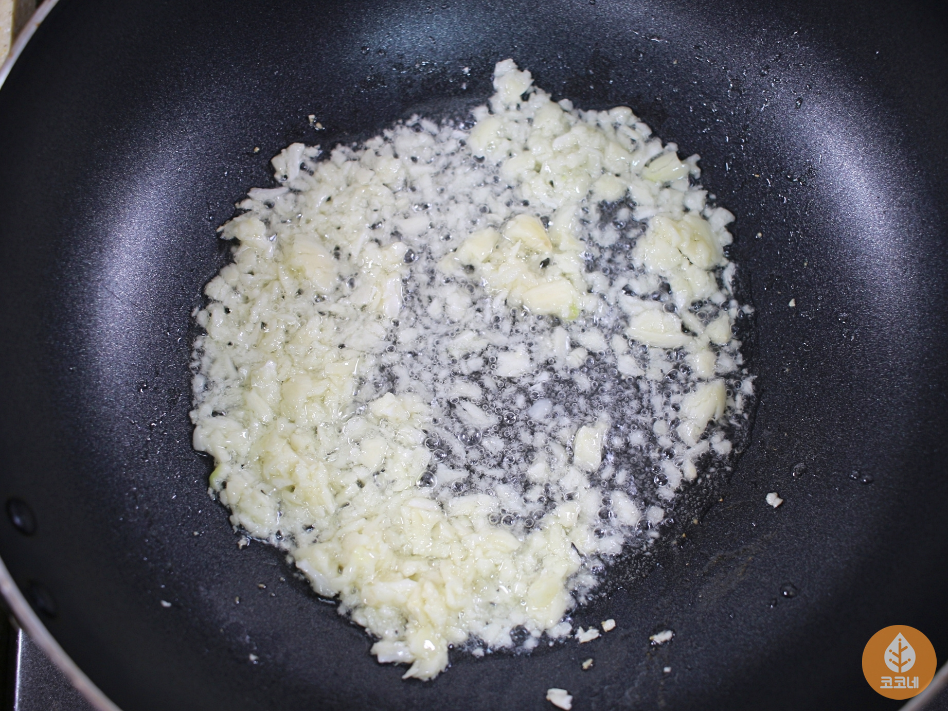 후라이팬에 식용유4큰술, 다진마늘2큰술 넣고