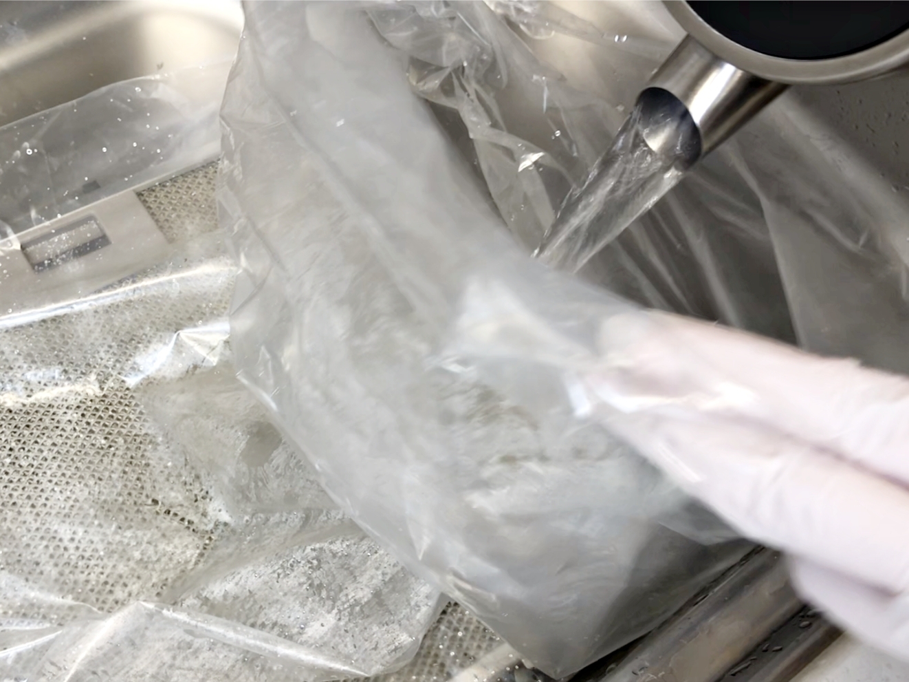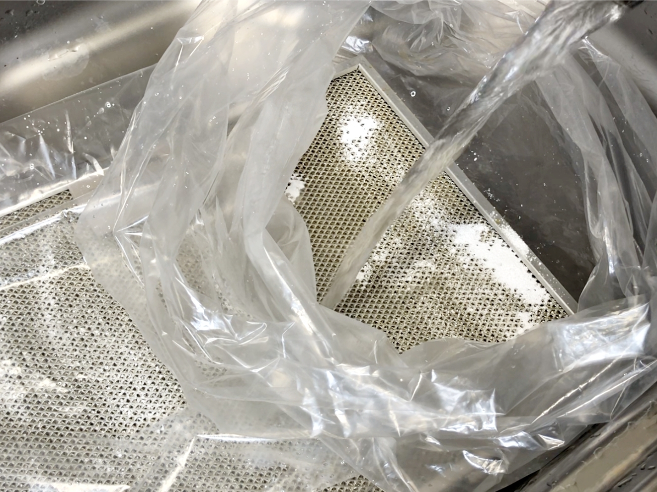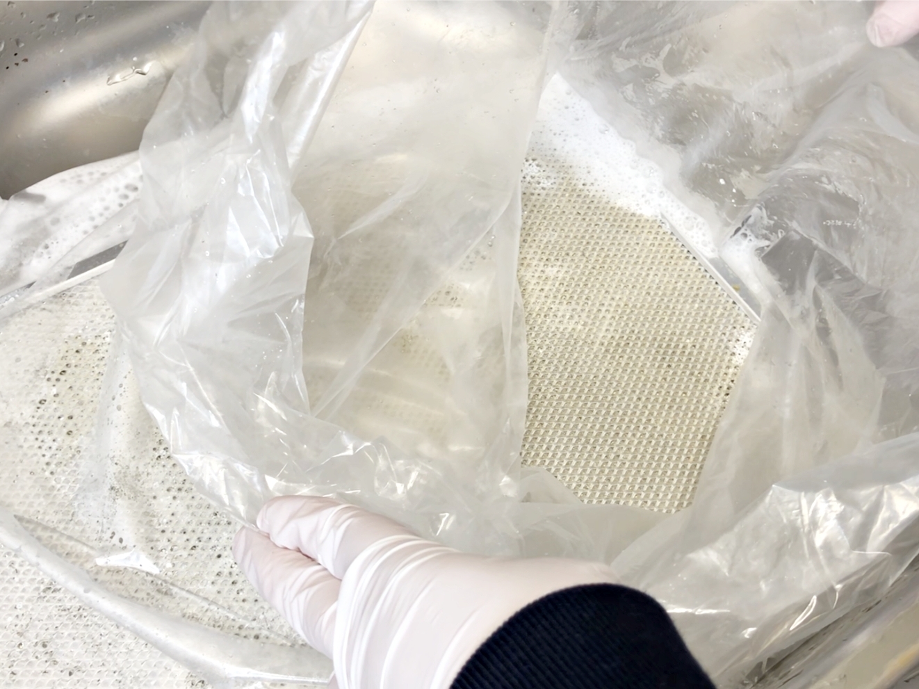 뜨거운 물로 헹군 필터를 김장비닐 안에 넣고