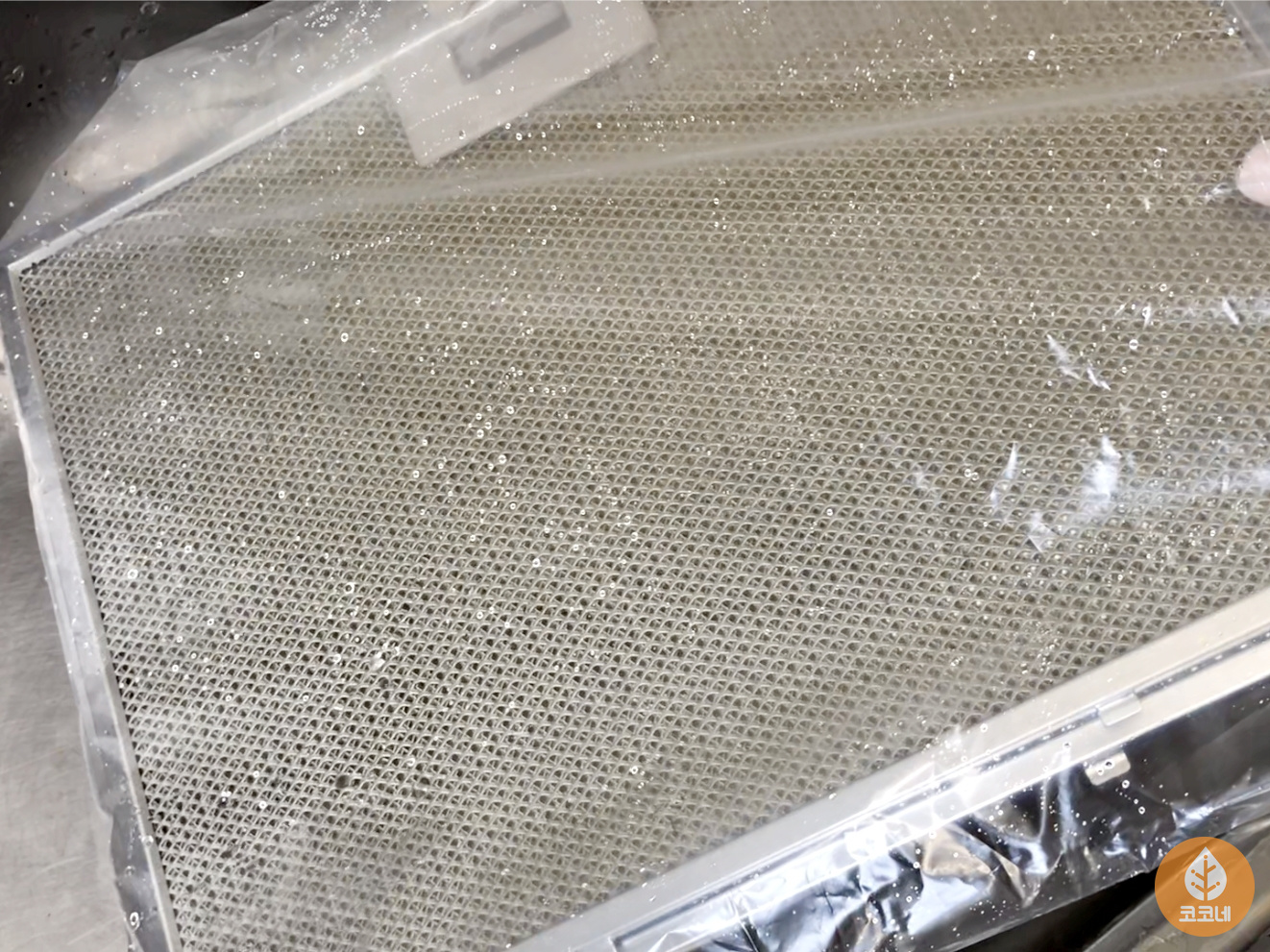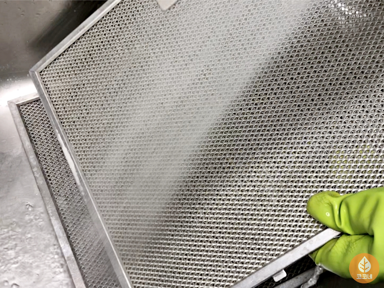 기름때 가득 낀 주방후드필터를 뜨거운 물로 헹군 뒤