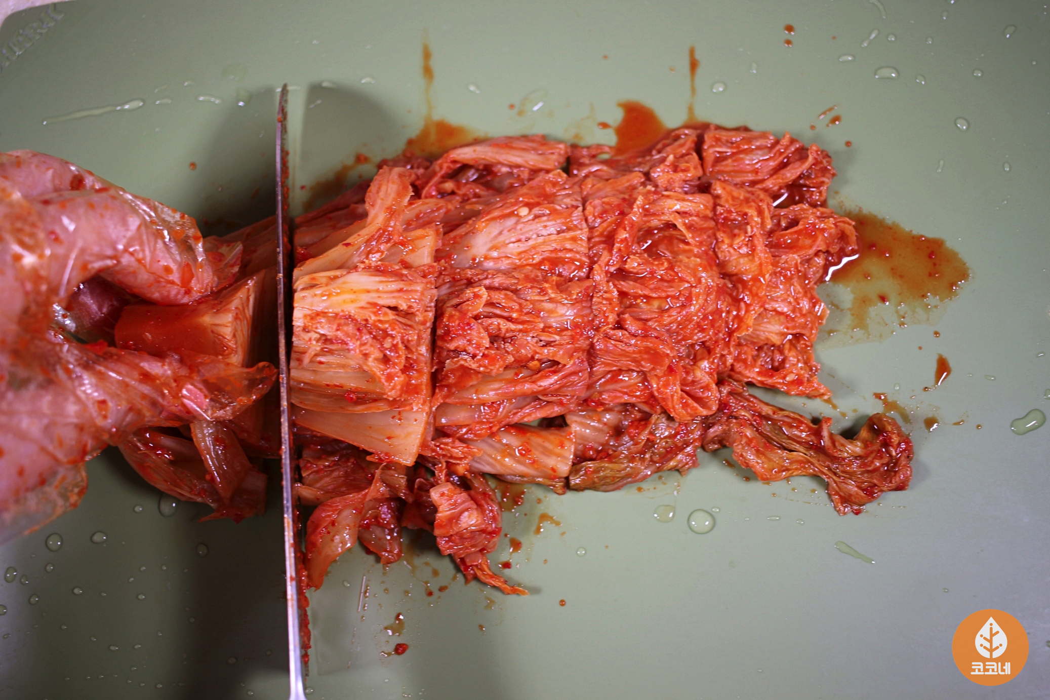 도마를 물에 먼저 헹구고 김치를 썰어보세요.