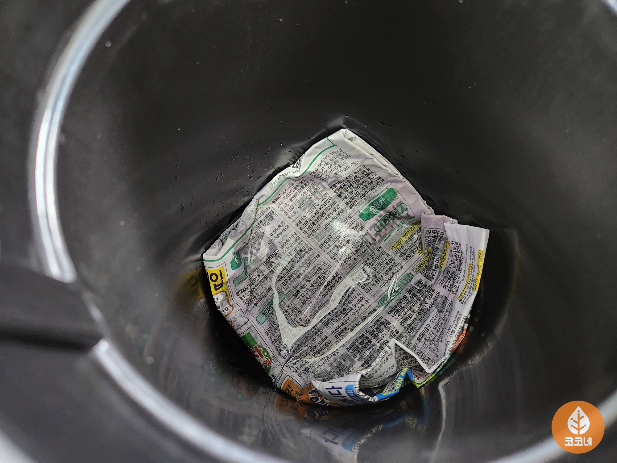 신문지를 접어서 쓰레기통 바닥에 깔아주세요.