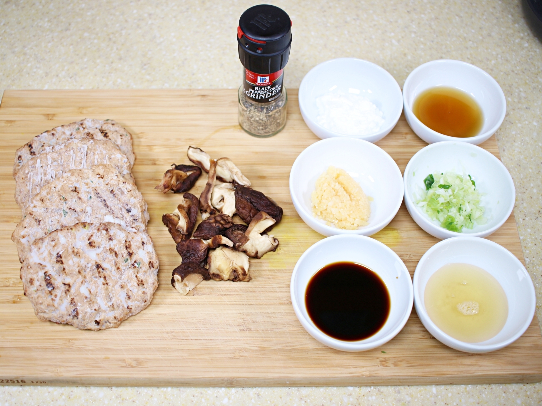 재료는 냉동떡갈비, 표고버섯, 다진마늘, 대파,