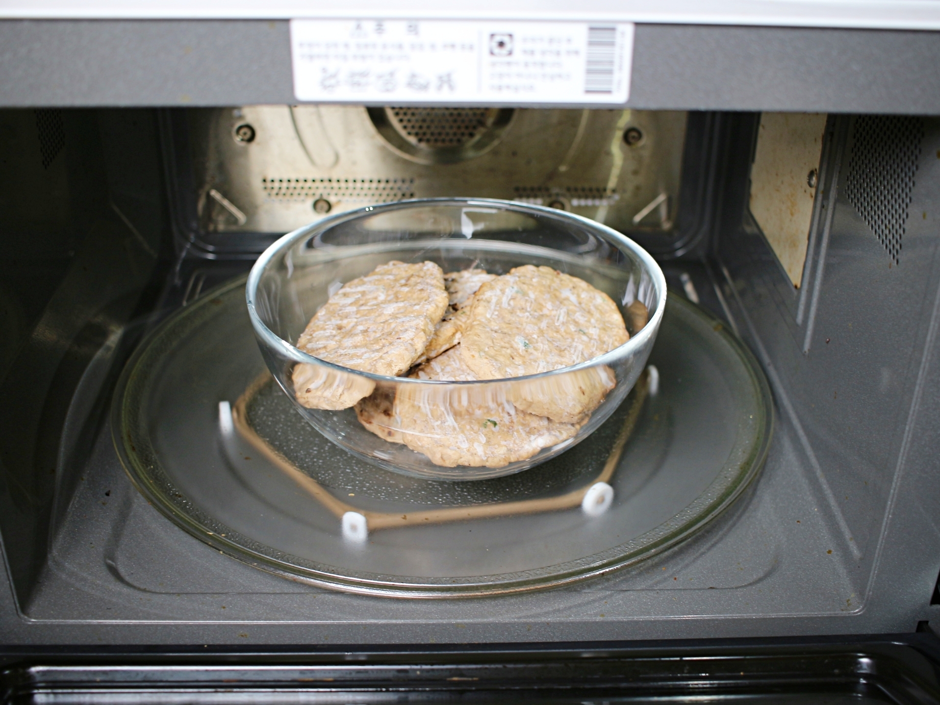 냉동 상태의 떡갈비를 전자레인지로 돌려서 해동하고,