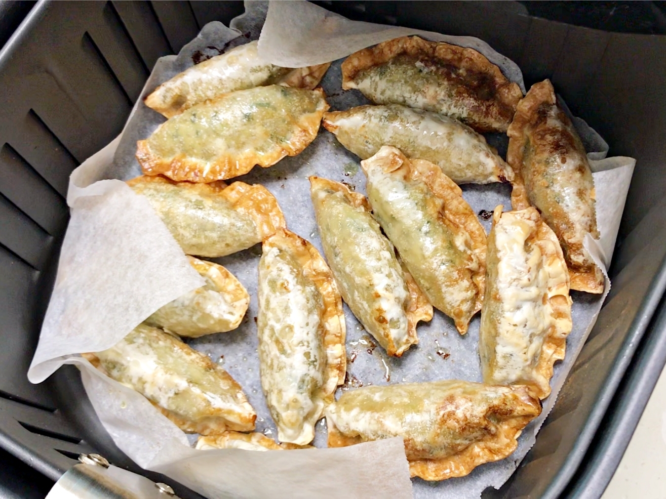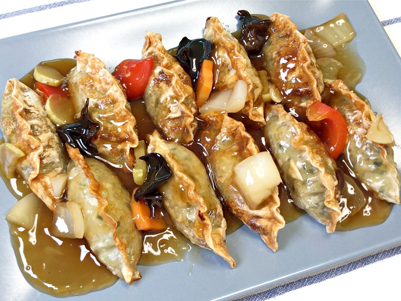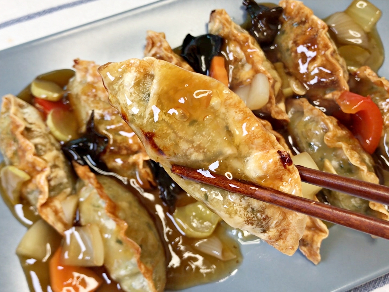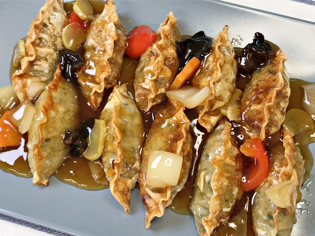바삭하게 구워진 만두 위에