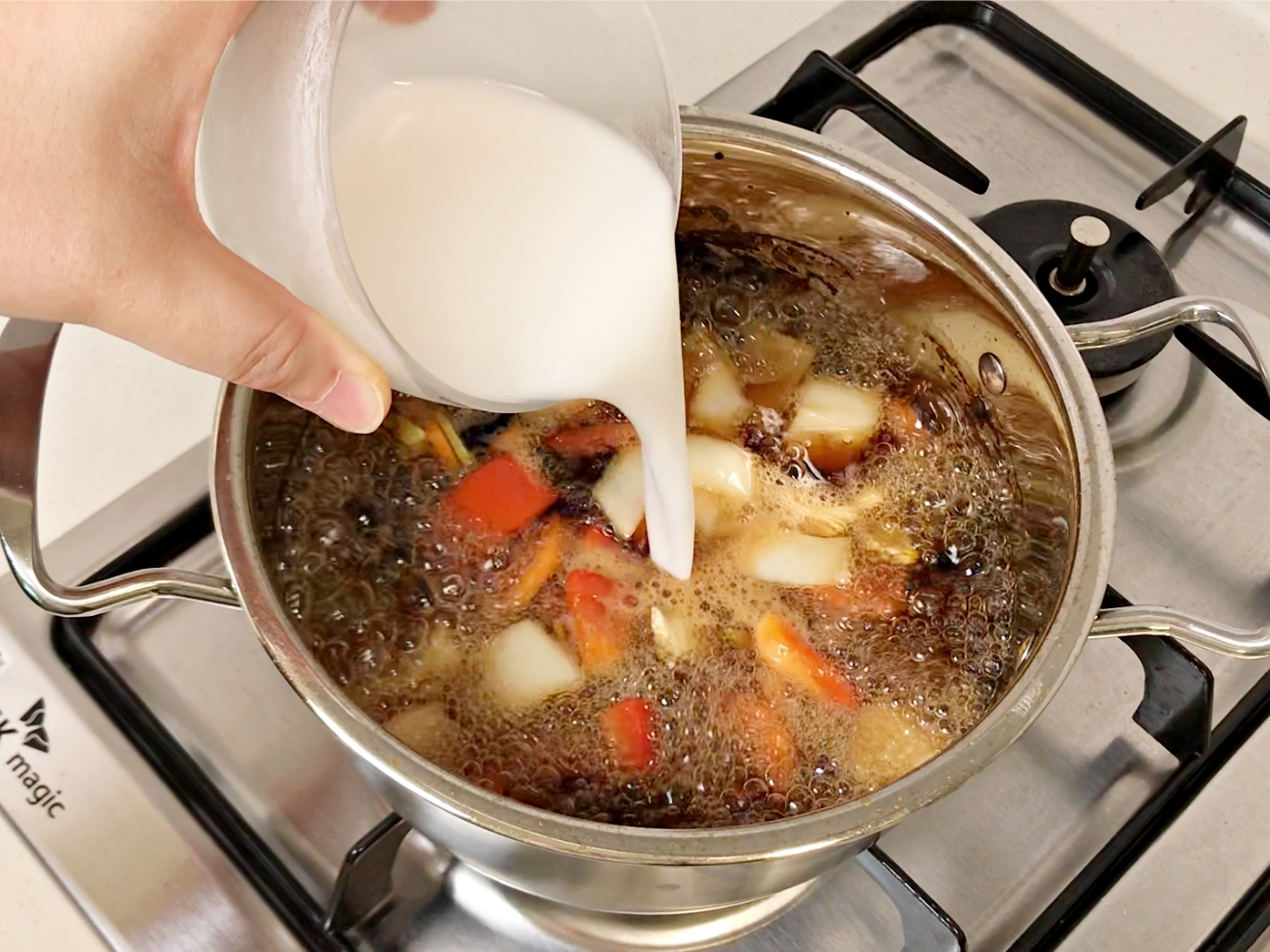 조금씩 넣고 저어가면서 농도를 맞춰주시면 돼요.