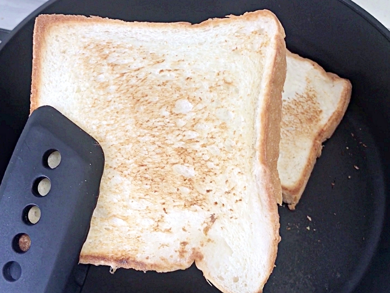 예열한 후라이팬에 냉동식빵을 올려주세요.