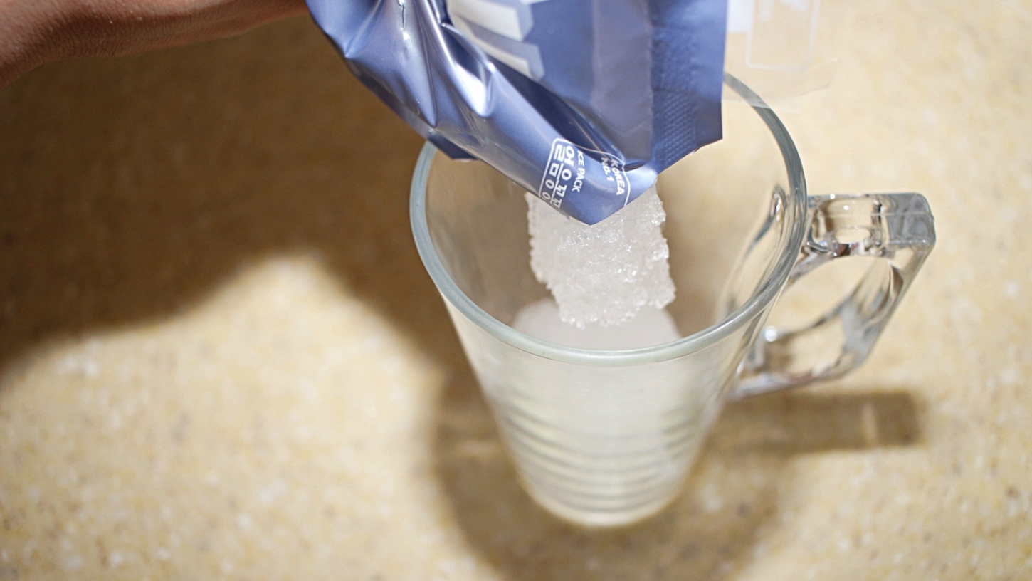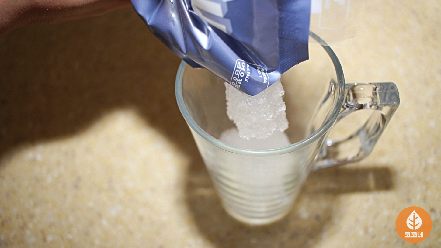 아이스팩을 잘라서 내용물을 컵에 담아요.