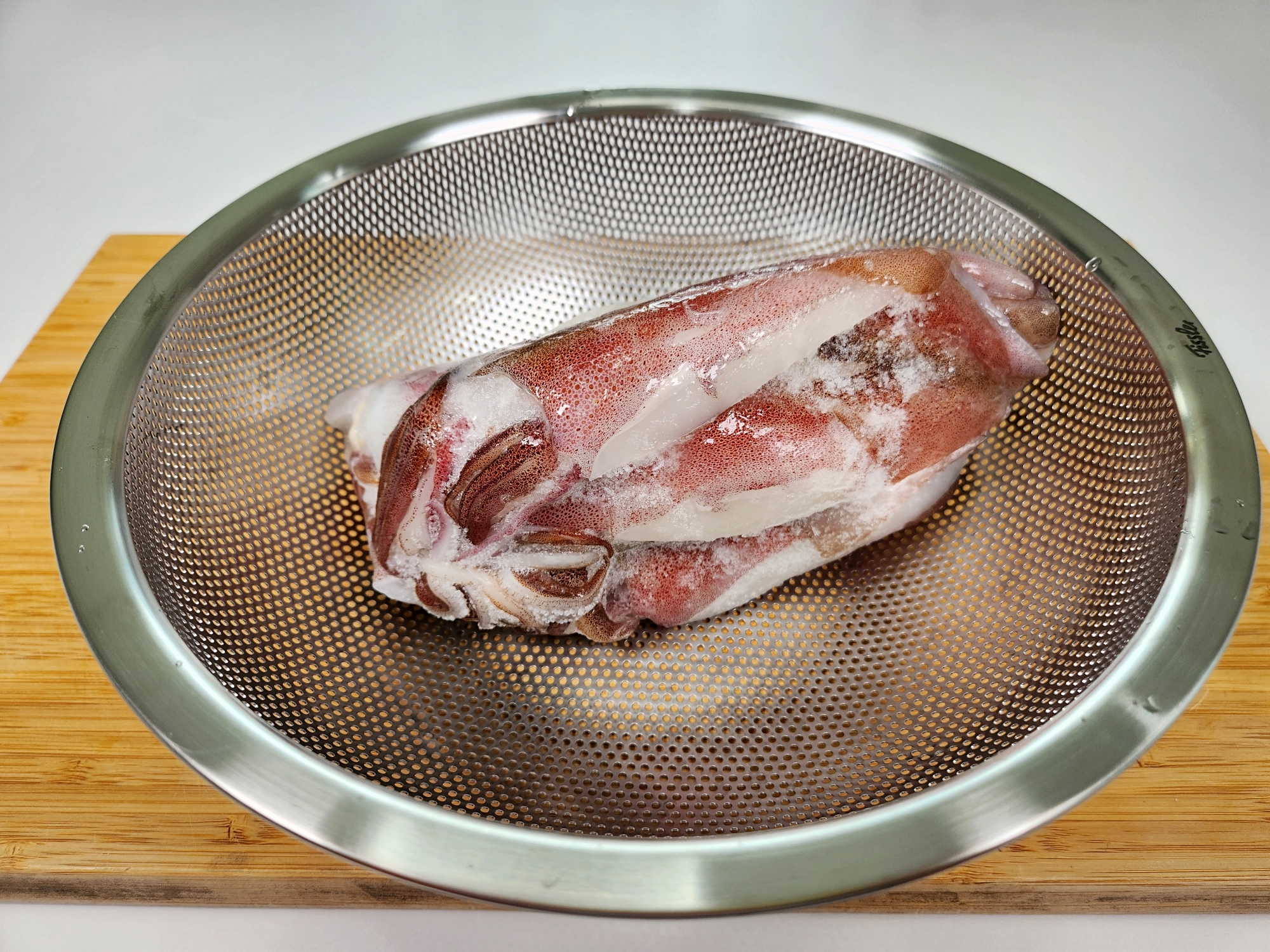 냉동실에 꽁꽁 얼려둔 오징어를 해동해 볼게요.