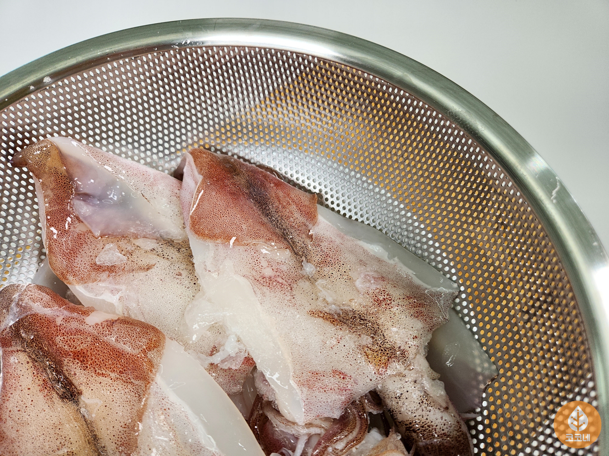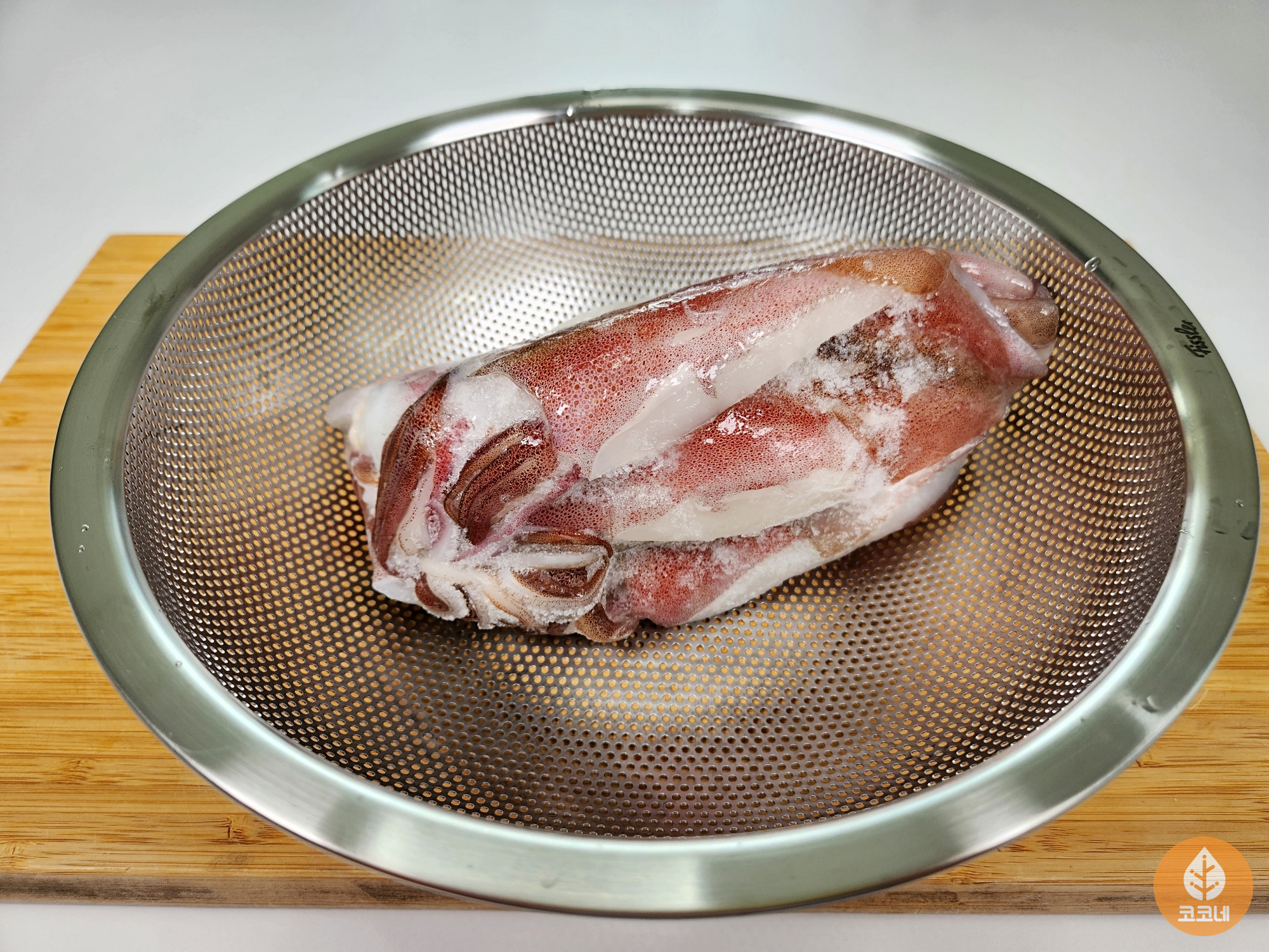 냉동실에 꽁꽁 얼려둔 오징어를 해동해 볼게요.