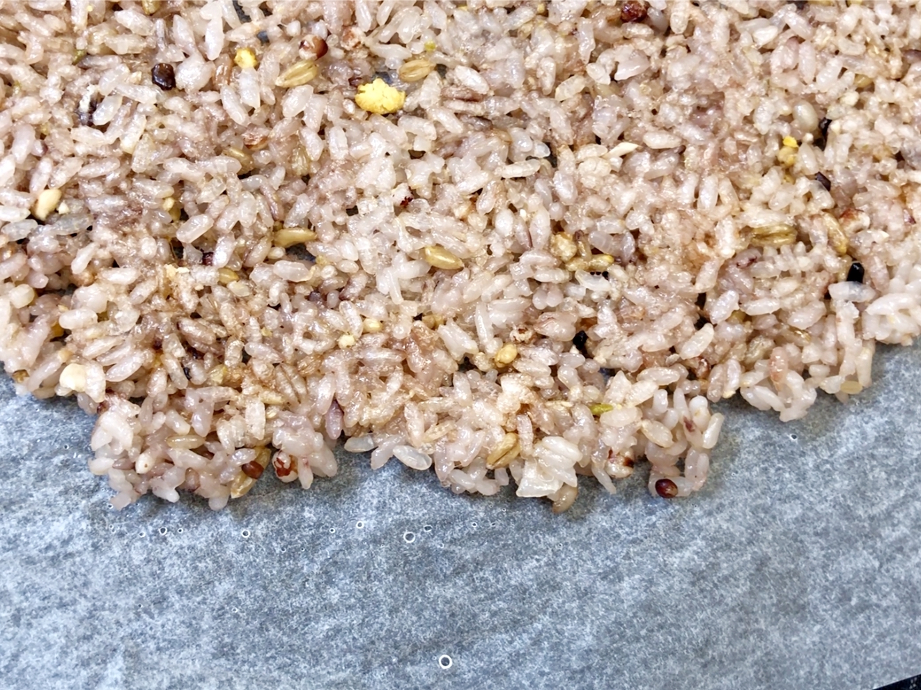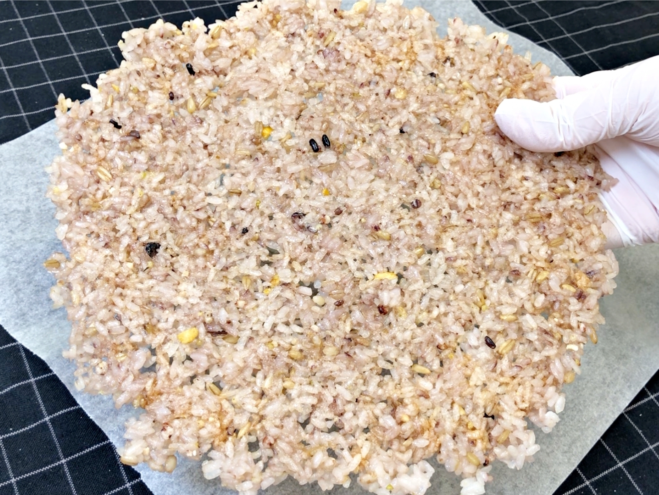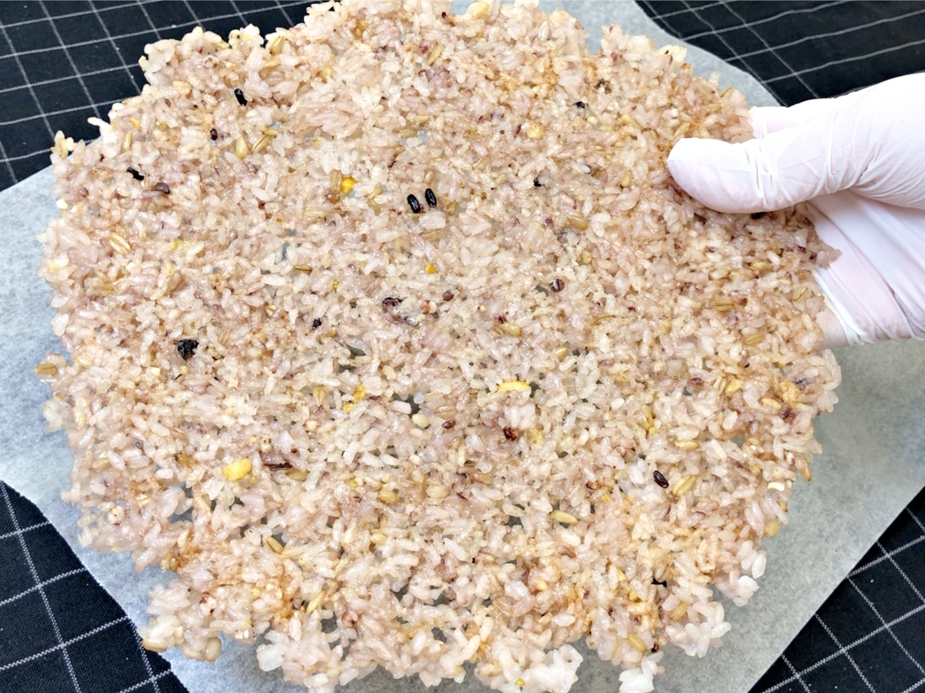 종이호일 위에 밥을 넓적하게 펼쳐주세요.