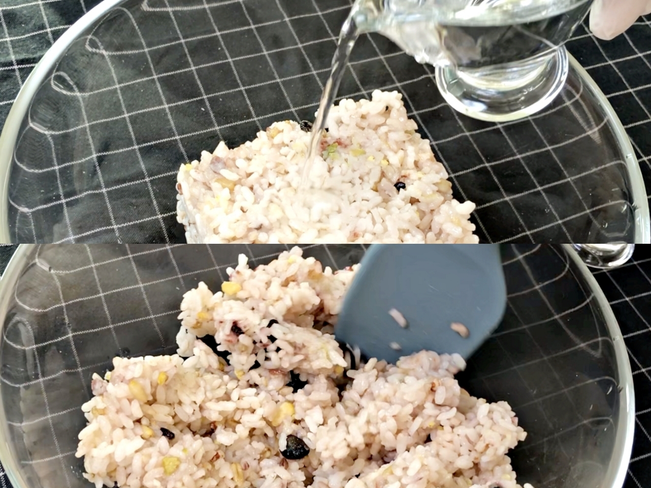 찬밥에 물을 아주 조금만 부어서 뭉친 밥을 풀어주세요.