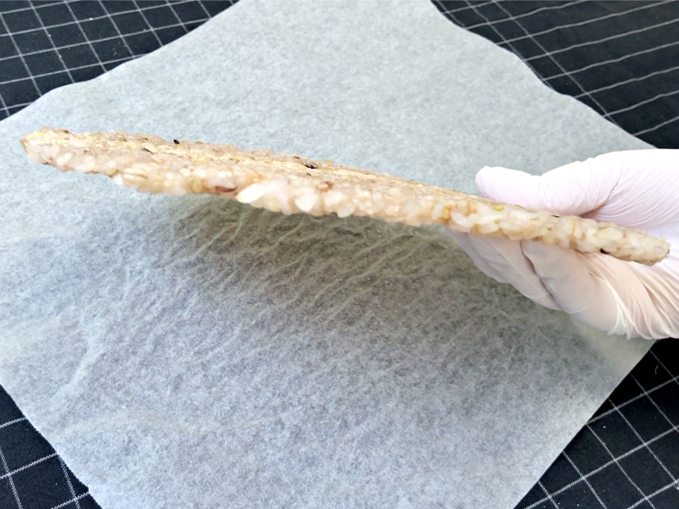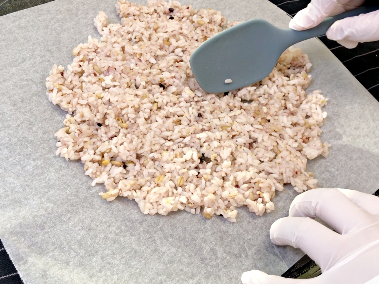 종이호일 위에 밥을 넓적하게 펼쳐주세요.