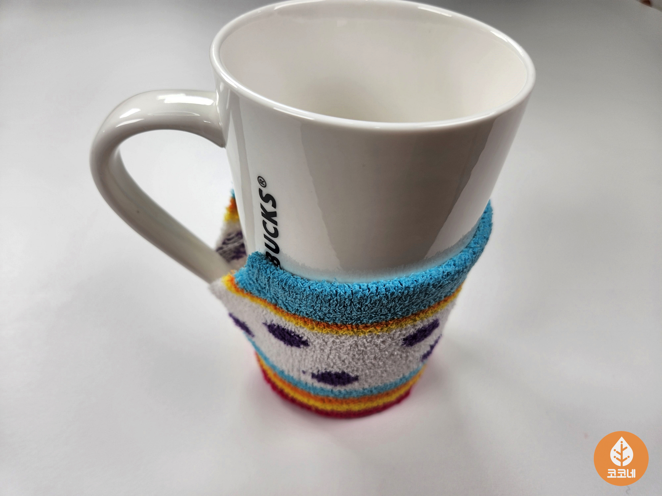 잘라낸 수면양말 윗부분을 컵에 씌우면