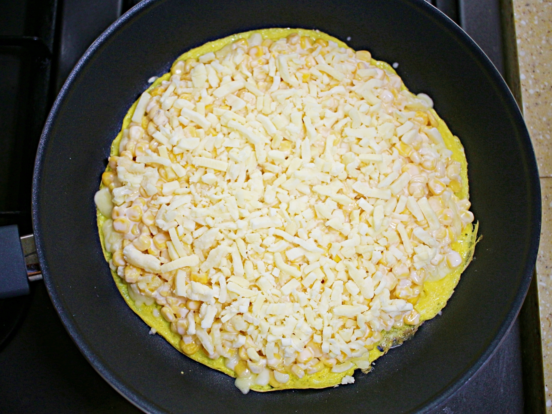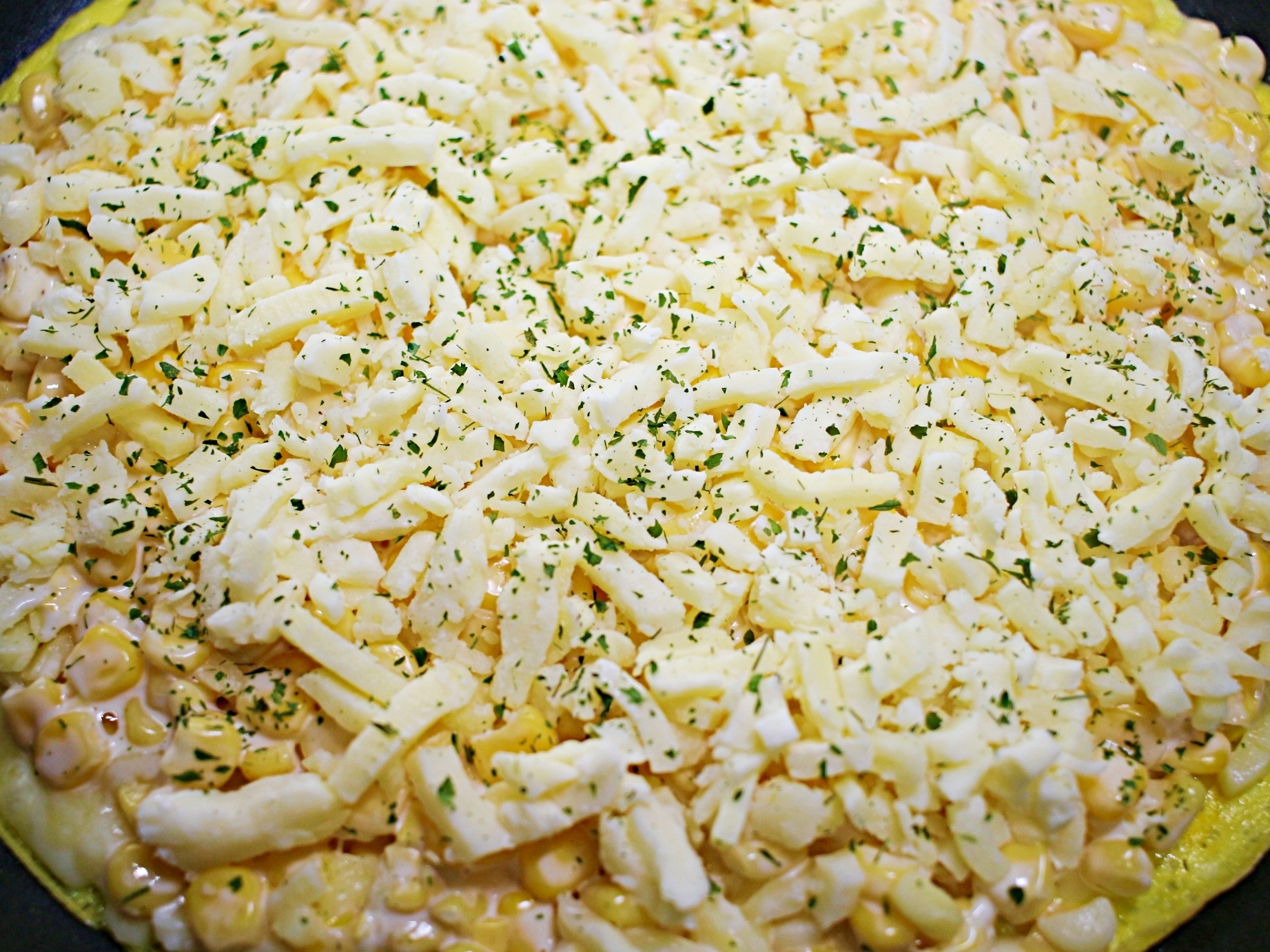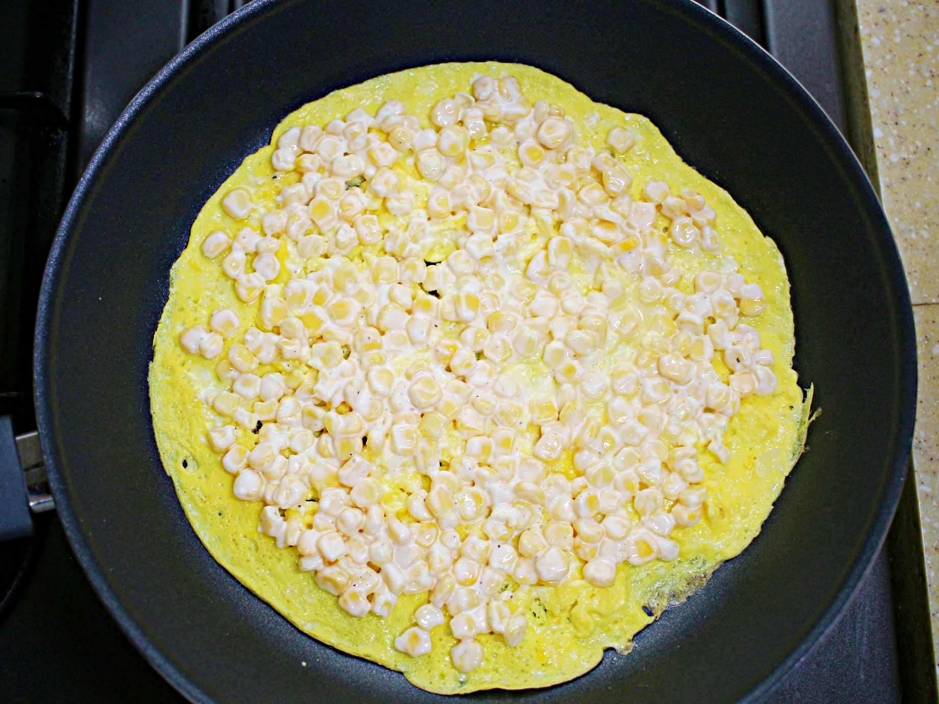 계란이 70%쯤 익으면 콘샐러드 토핑으로 올려주세요.