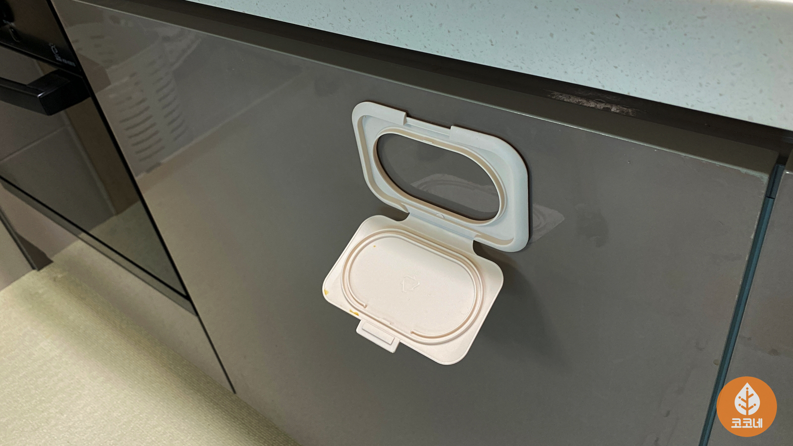 다 쓴 물티슈캡을 싱크대 문에 붙였더니?!