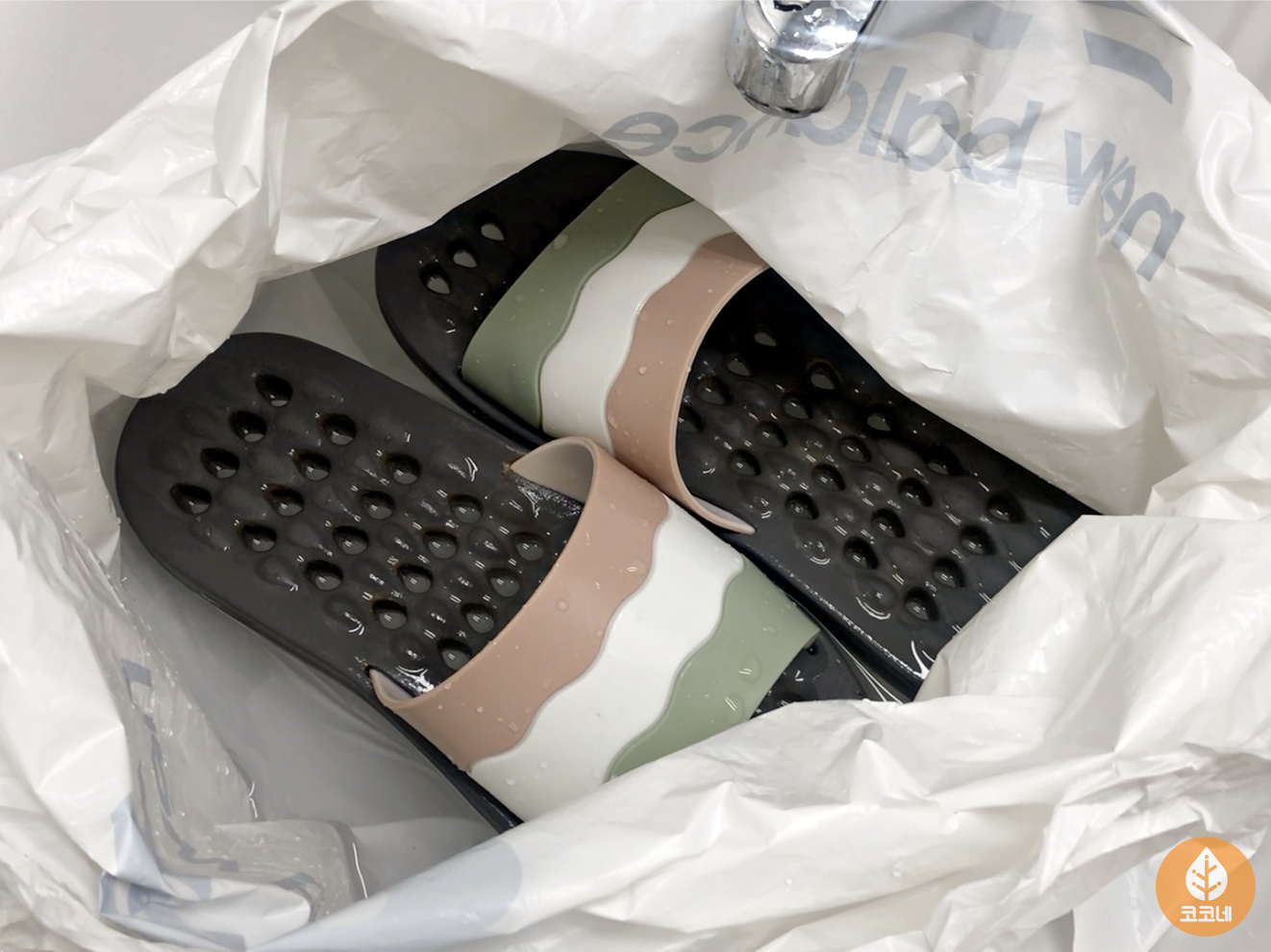 화장실 슬리퍼를 넣고 살살 흔들어 주세요.