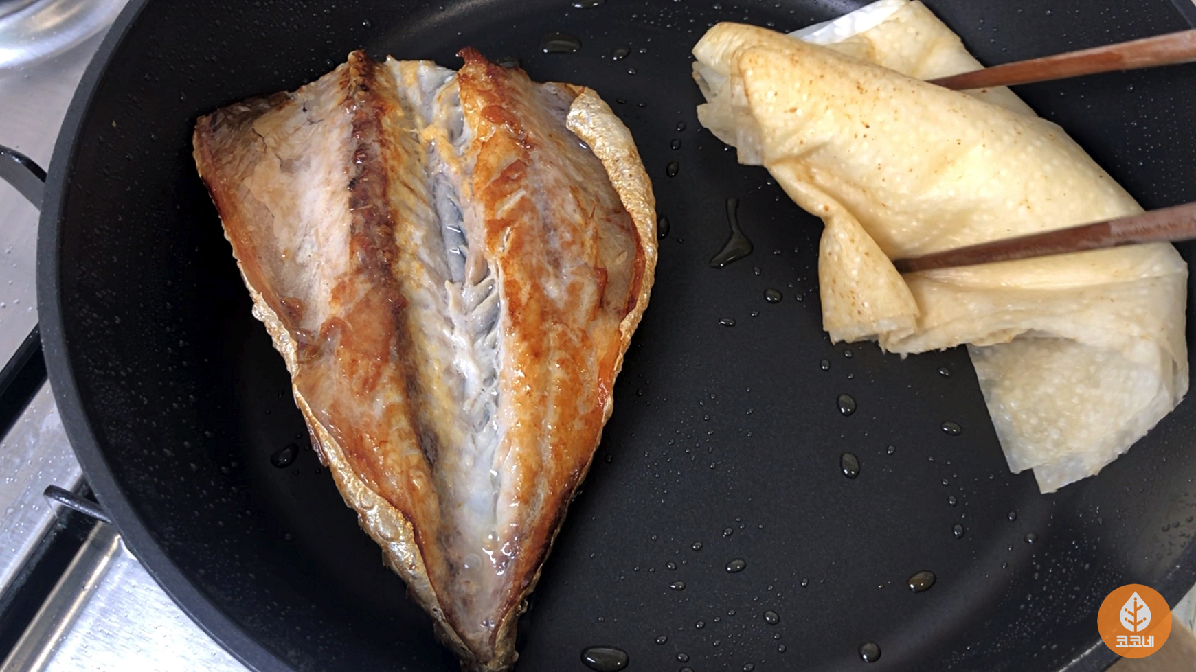 꼭 기름 및 수분을 제거하고 센불로 구워주세요.