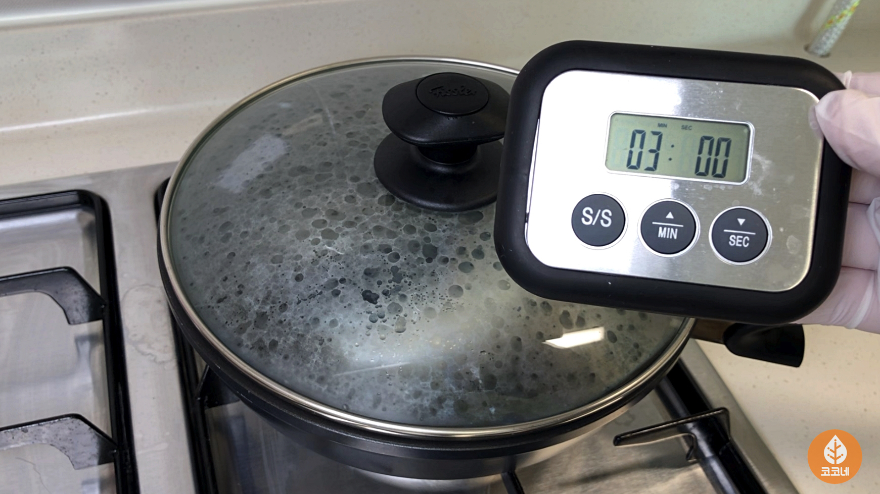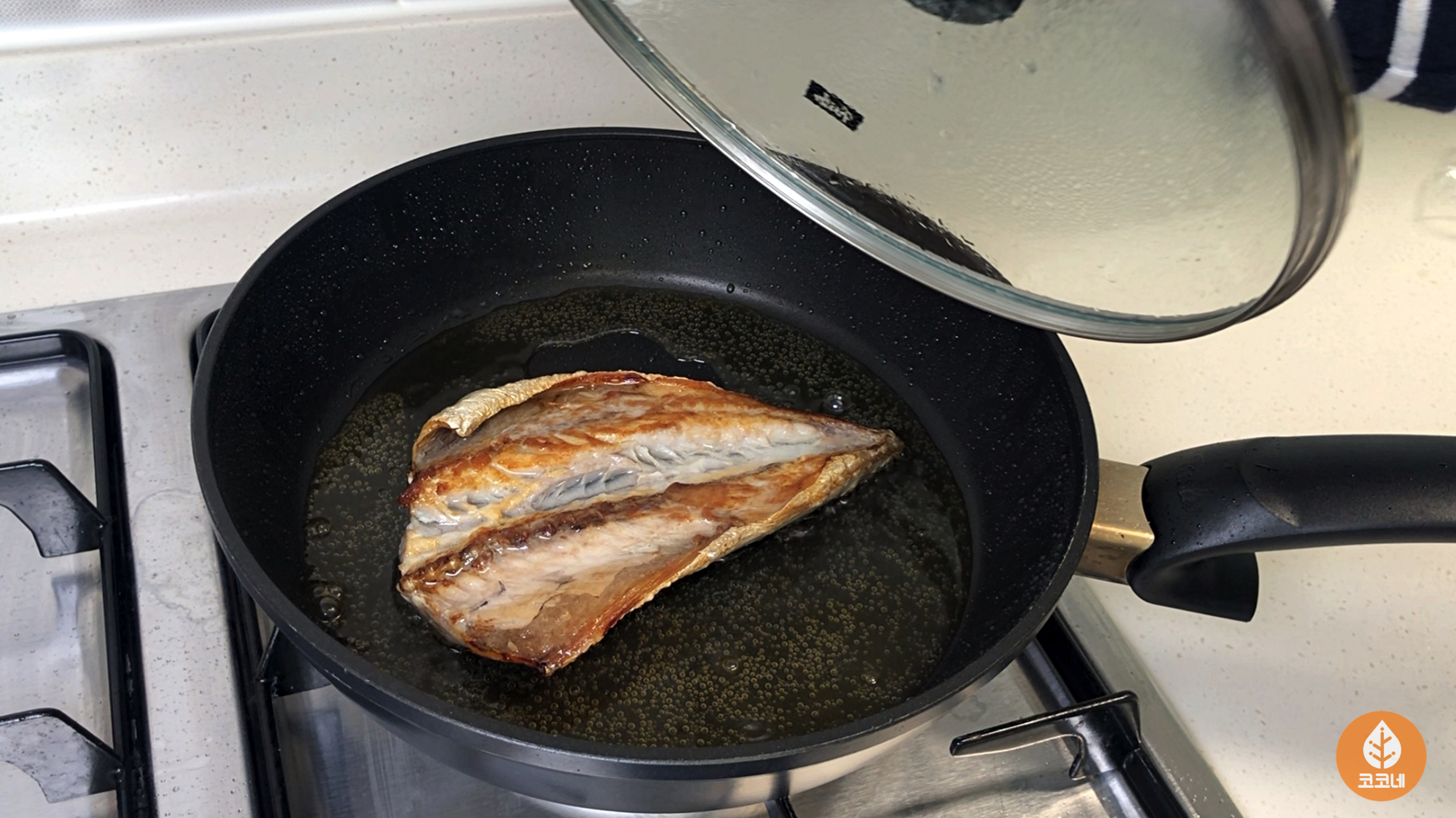 프라이팬 뚜껑을 닫고 3분정도 구워요~